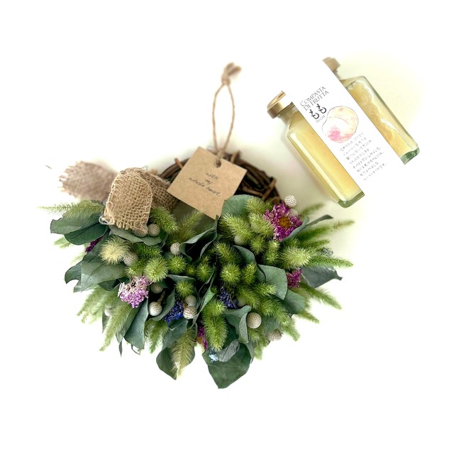 初夏を告げるグリーンミニリース『一瞬の風になれ』と、初夏の果物のジャムをセットにした、少しお得なギフトセットです。 父の日や、さまざまなお祝いごとや、ご自分へのご褒美にも。 ジャムは、『もも』または『はるか』のいずれかをお選びいただけます。 眩しい初夏をめいっぱいお楽しみください。 ※ジャムは開封前も冷蔵にて保管ください。 開封後はなるべくお早めにお召し上がりください。 ※ジャムの原料などの詳細は、それぞれの商品ページをご覧ください。 ※リースは自然素材を使用しています。フレッシュな状態のもの、ドライの状態のものと混在しますが、いずれも時間の経過とともにドライが進み、風合いが変化いたします。 その変化も含め、お楽しみください。 ※素材の特性上、防虫処理(煮沸または冷凍処理など)は施しておりません。自然のものですので、虫などが付着している場合もありますことをご理解ください。 ※デリケートな素材を使用しているため、お取り扱いにはご注意ください。 梱包には細心の注意を払っておりますが、輸送途中の衝撃などにより、若干の素材の破損などが生じる場合があります。ご了承ください。 ※保存の際は、直射日光を避け、風通しのよい場所に保管ください。 ※ハンドメイド作品であることをご理解のうえ、ご購入ください。