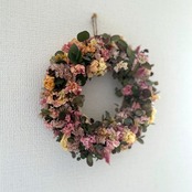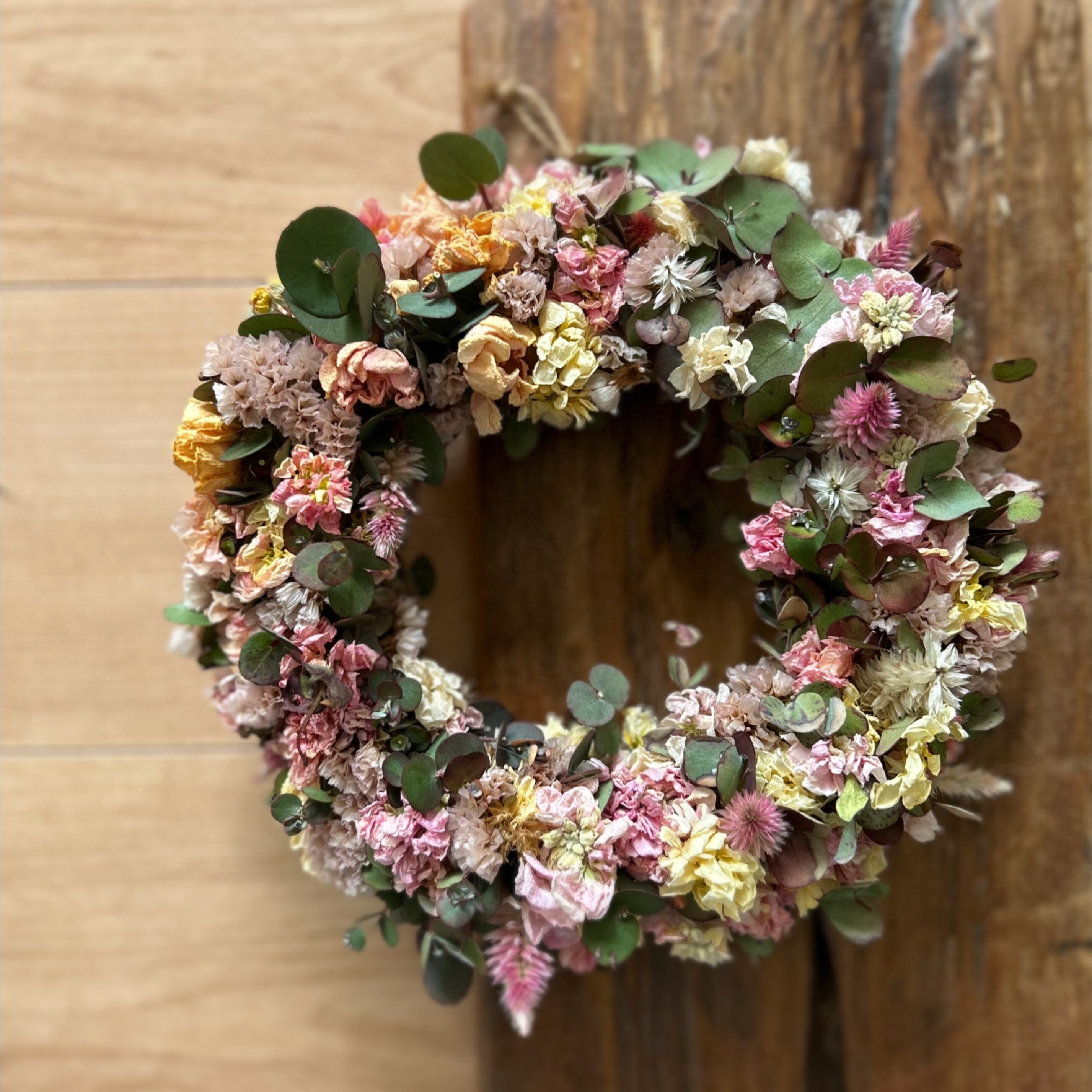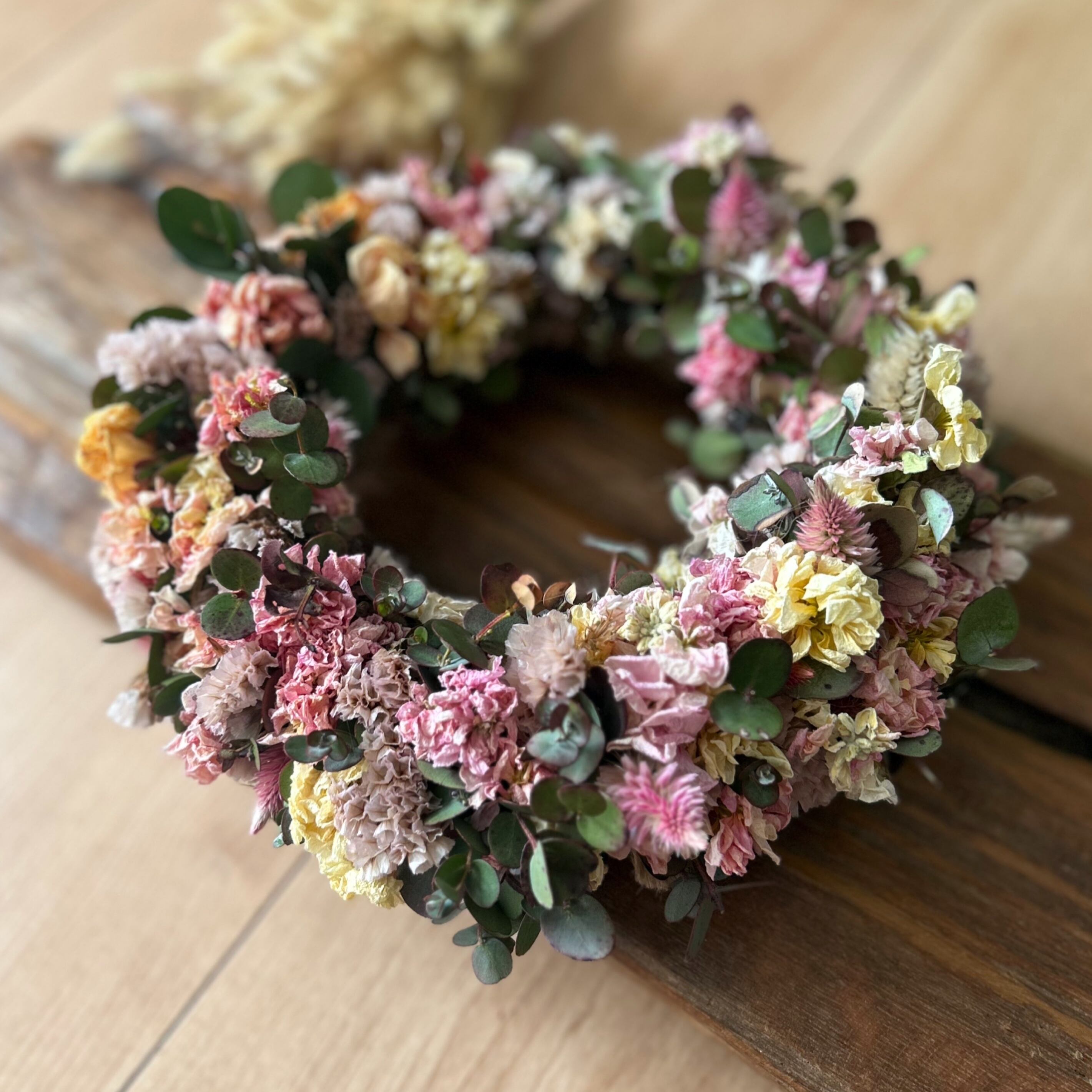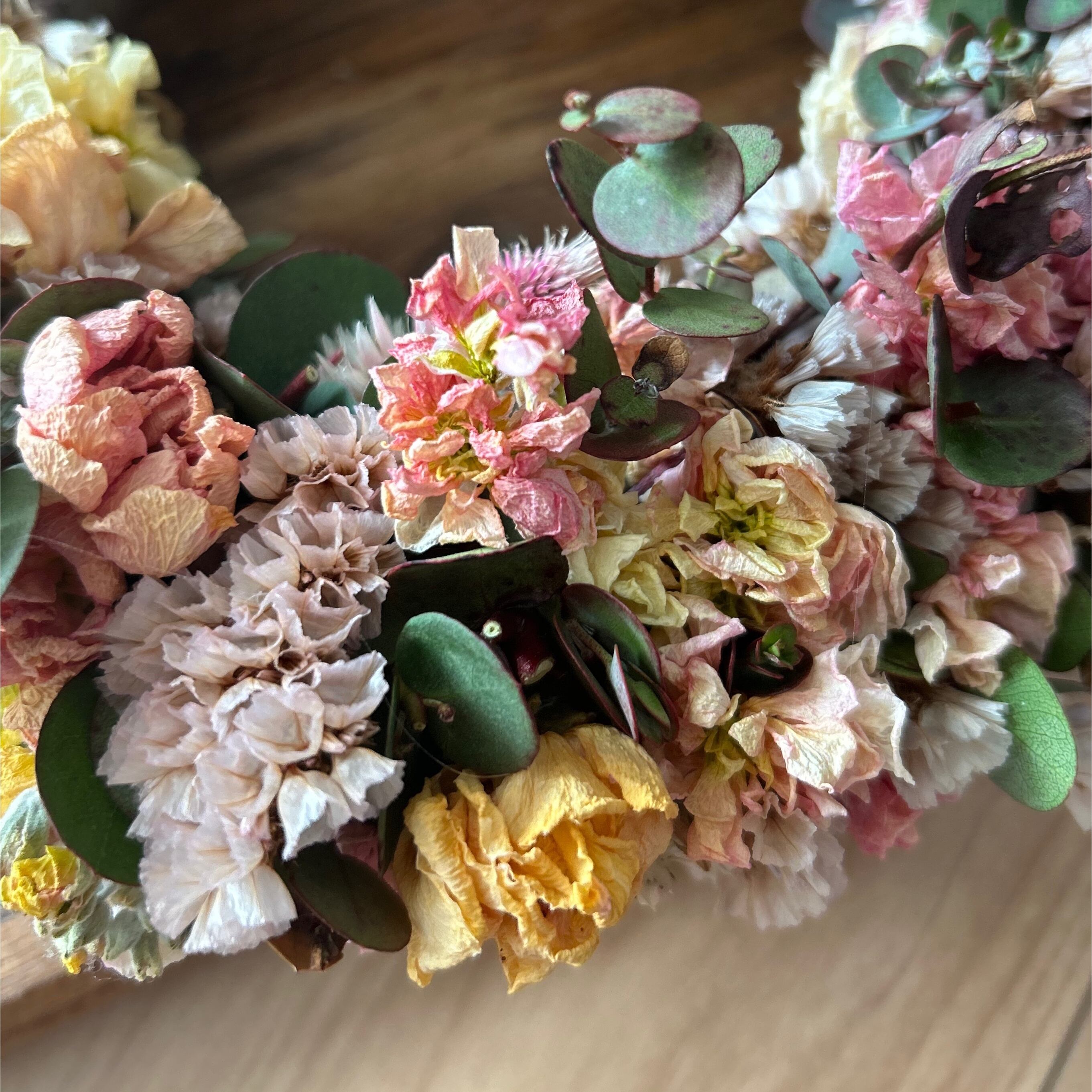 さてこちら、早春の千葉で買いだめて、ドライにしていたたっぷりのストックとユーカリをメインに、スターチスなどのドライフラワーも散りばめて。