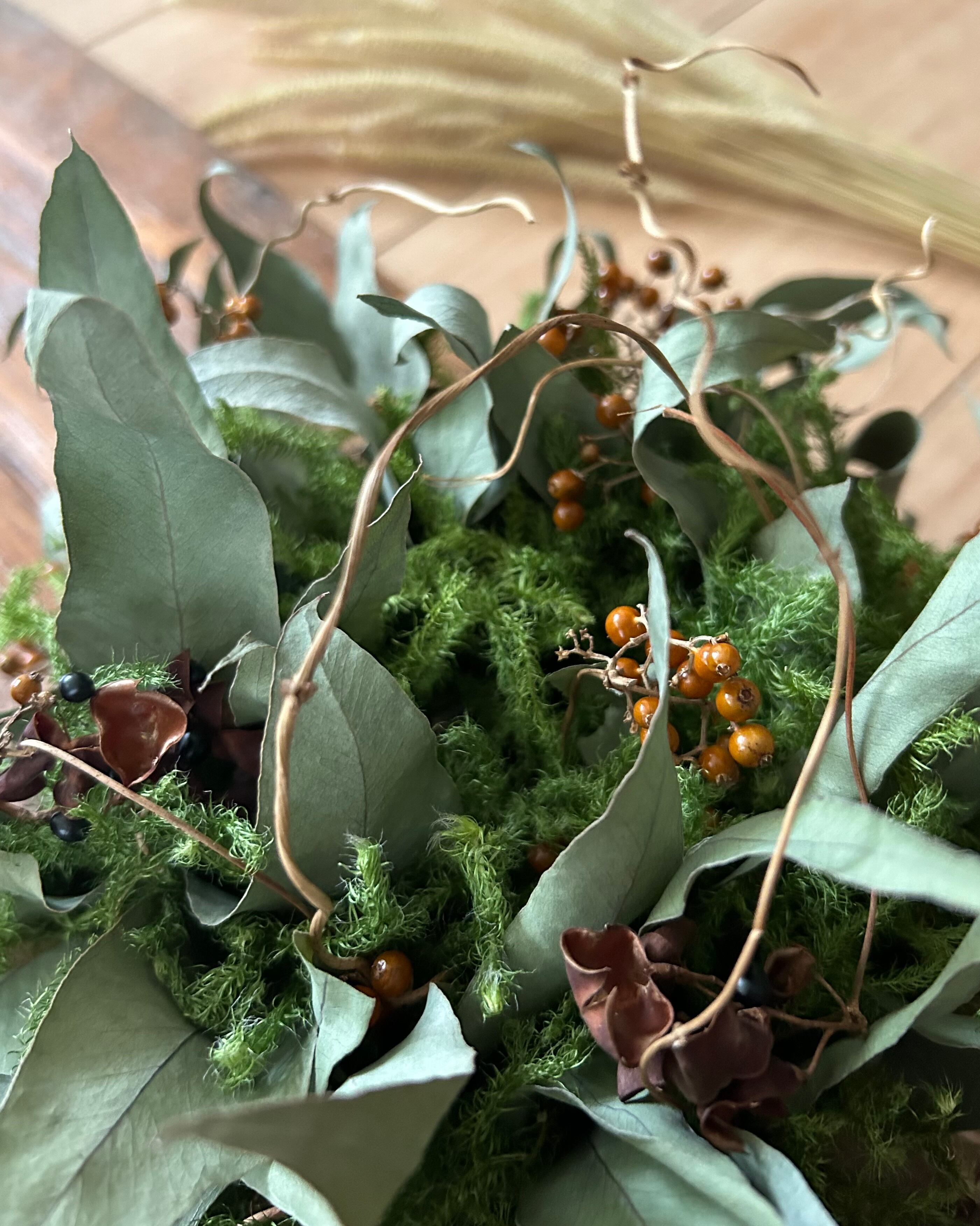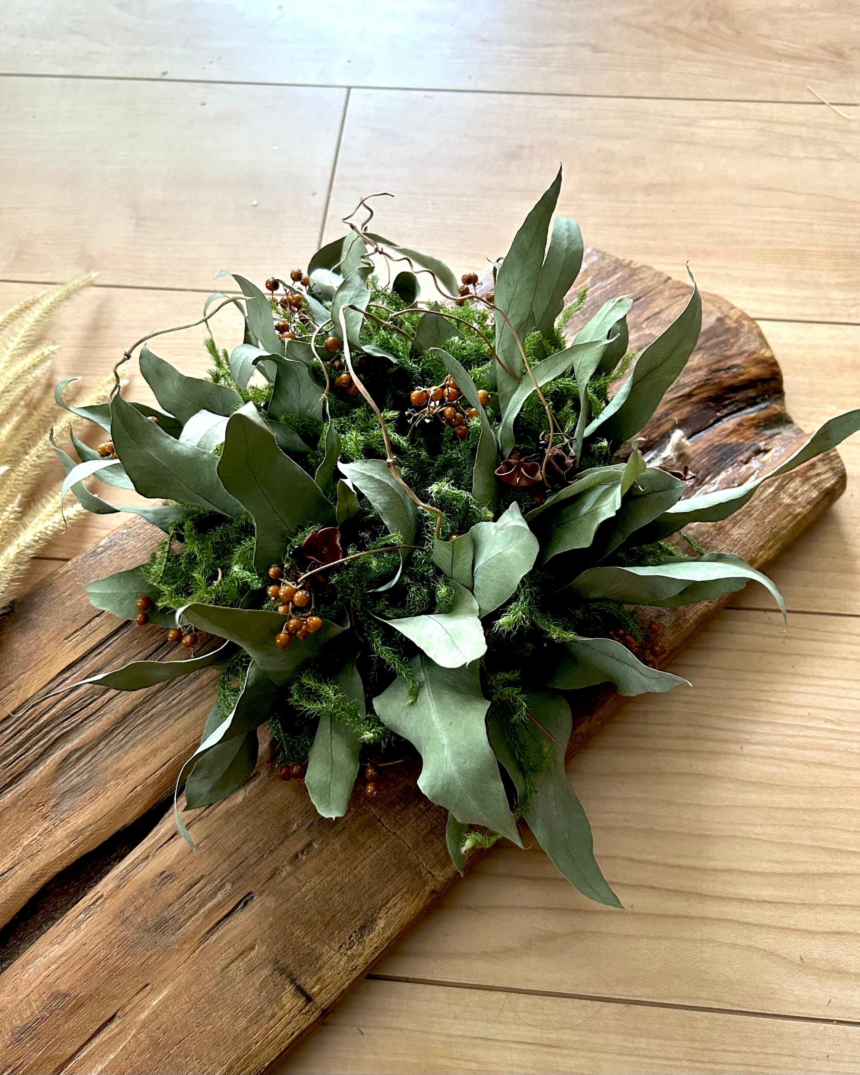 ユーカリとヒカゲノカズラを中心に作ったグリーンリース、直径20cm程度です。