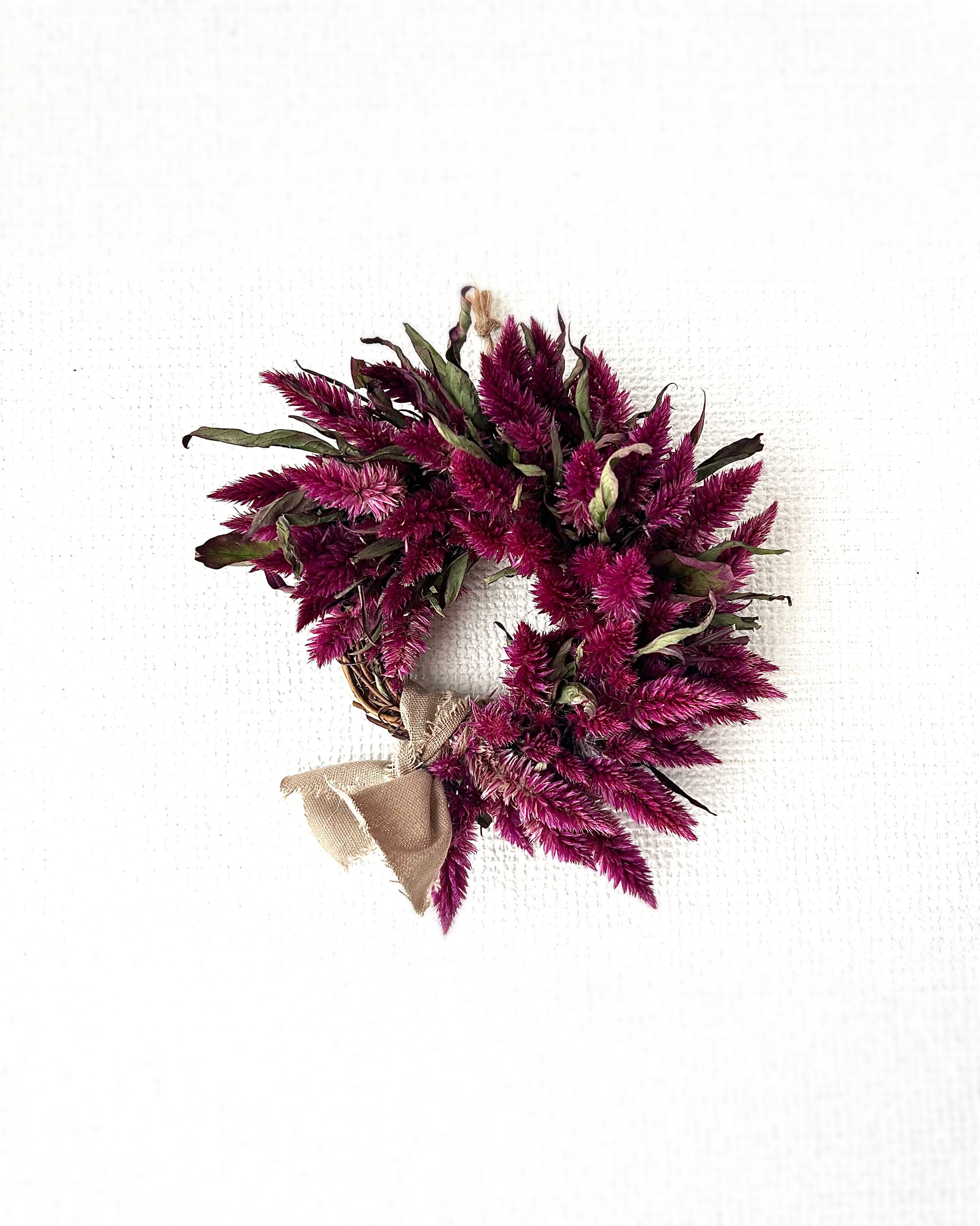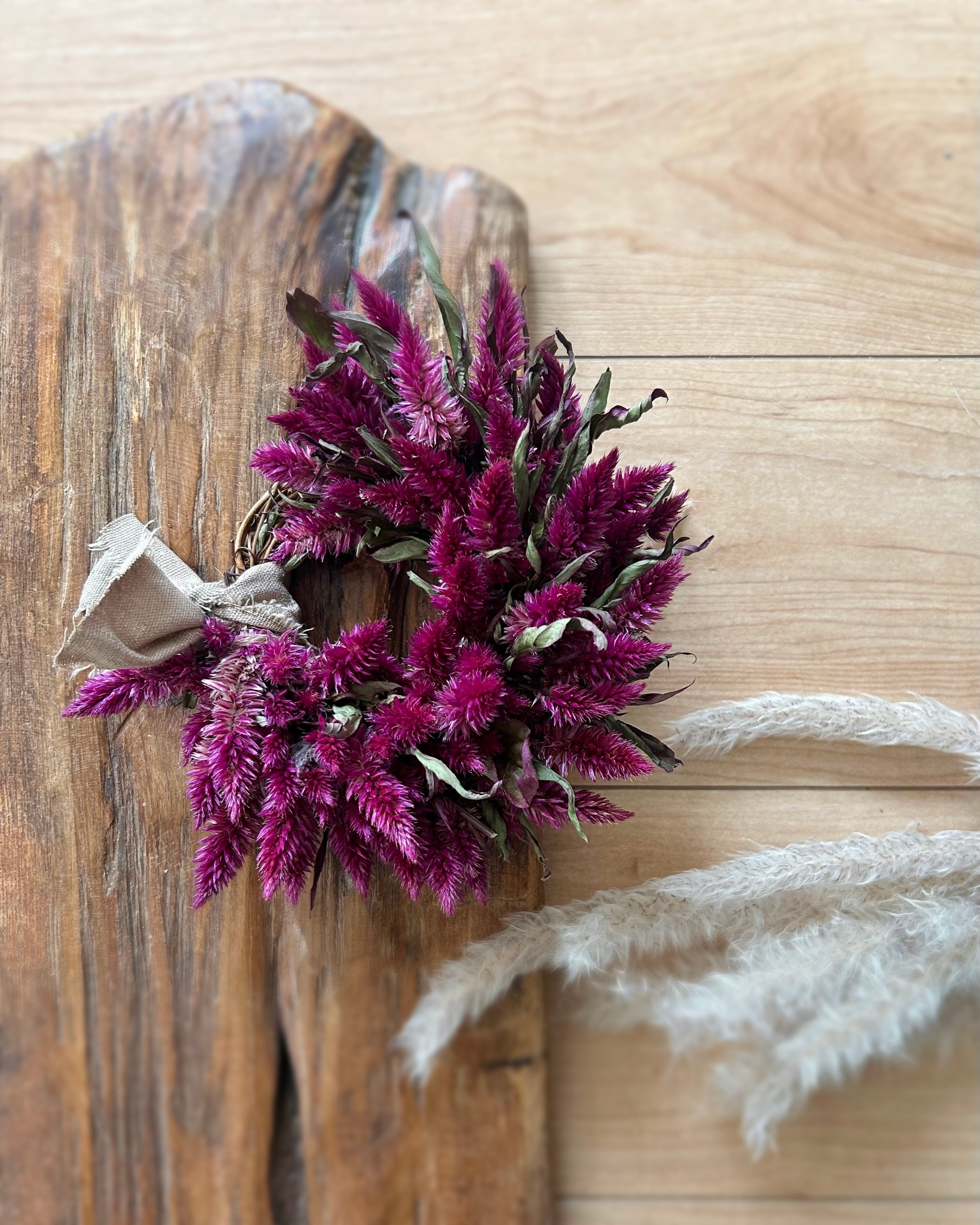 ケイトウのドライフラワーで作ったナチュラルリース、『心得』直径18cm程度です。