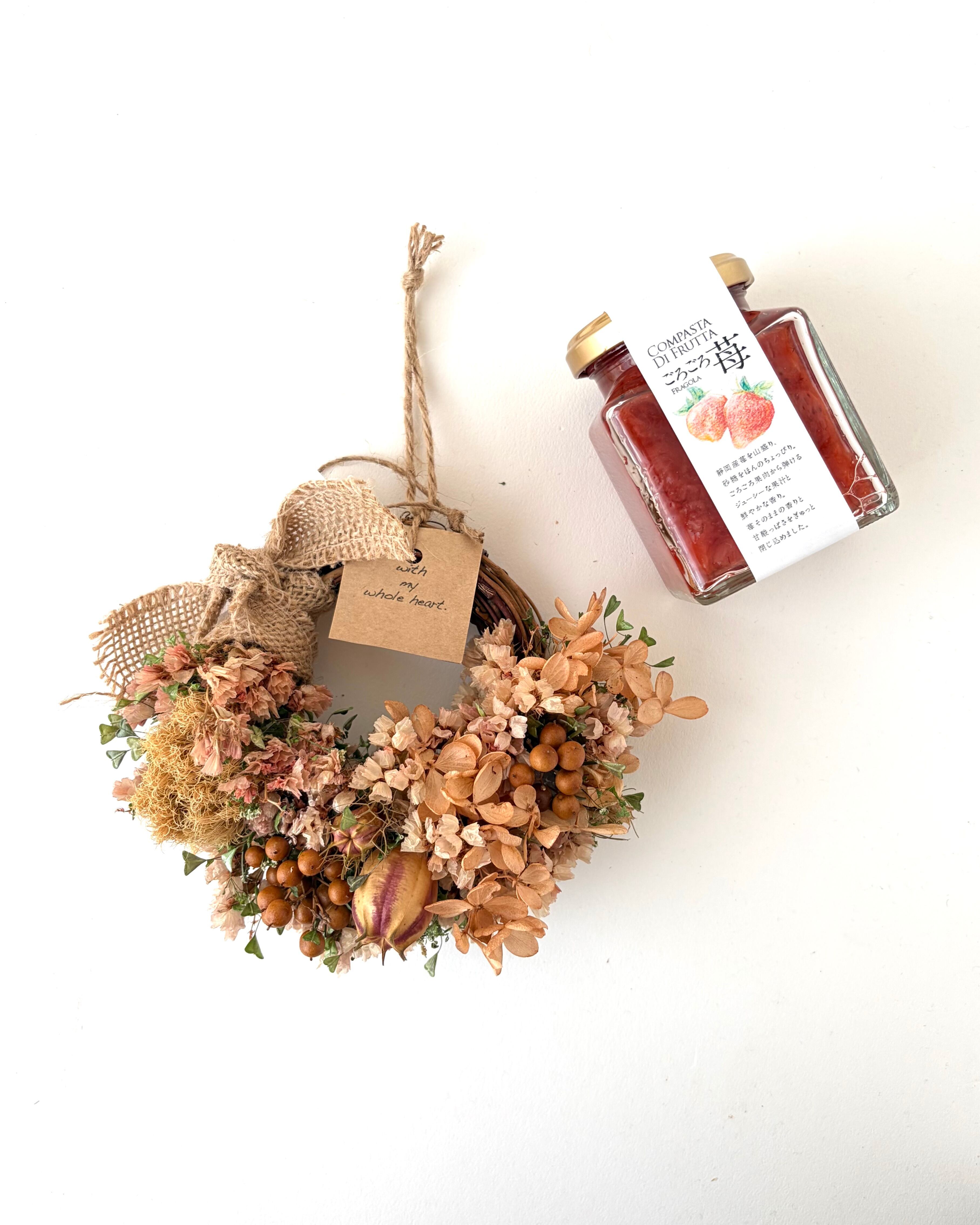 初夏を告げるドライフラワーのミニリース『響く歌声』と、ごろごろ苺ジャムをセットにした、少しお得なギフトセットです。