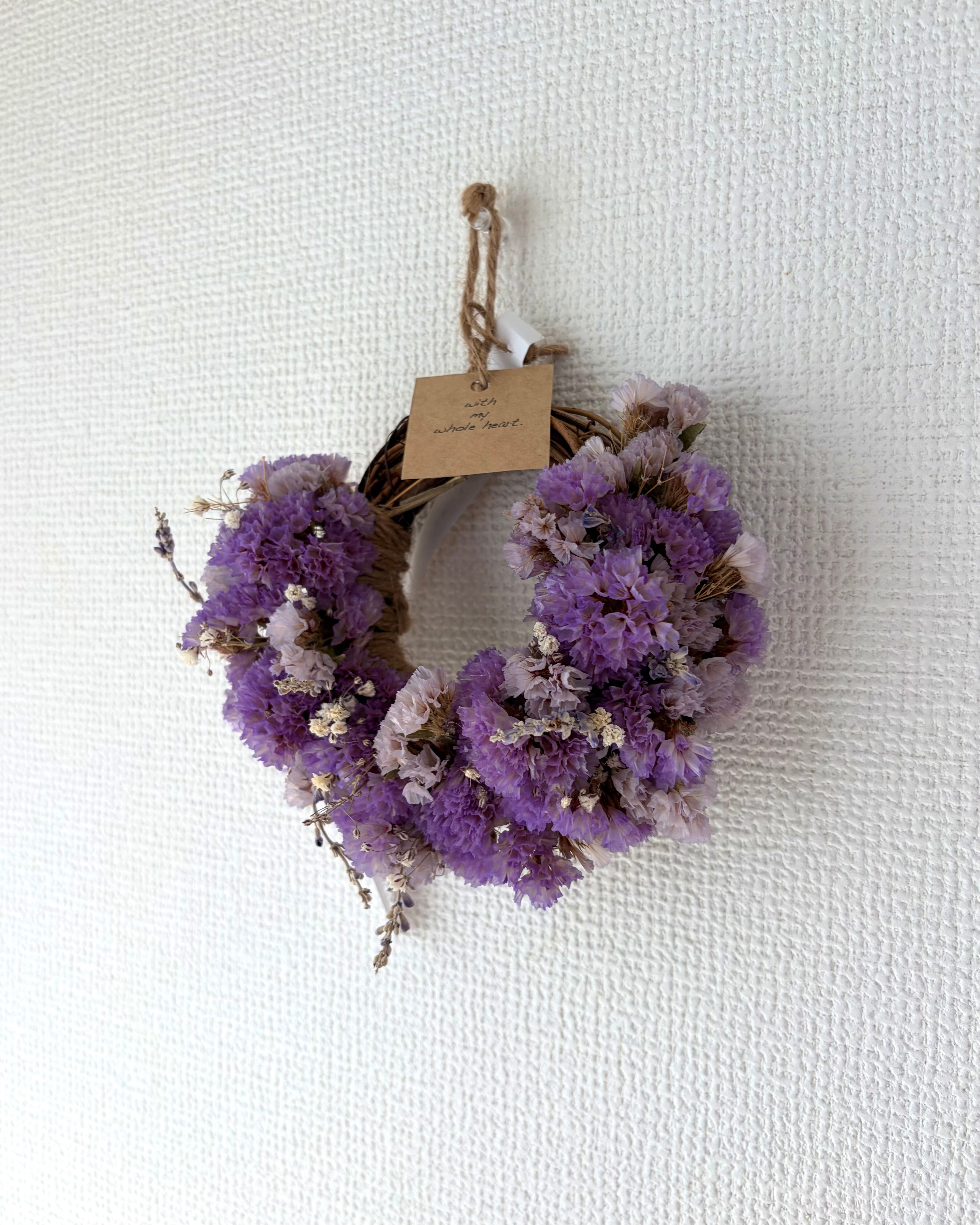 柔らかなパープルのスターチスに、霞草などを散りばめた、ドライフラワーのミニリースです。