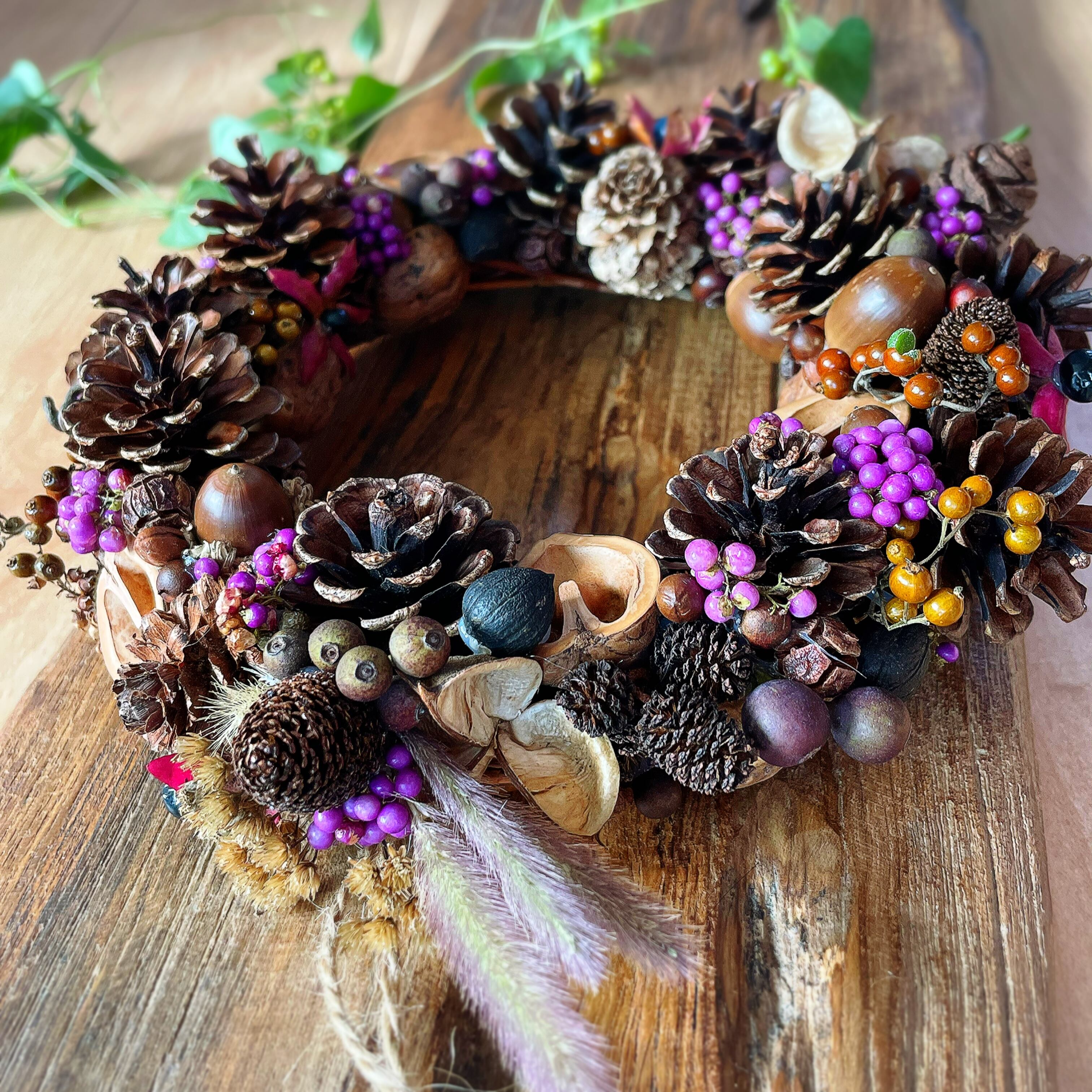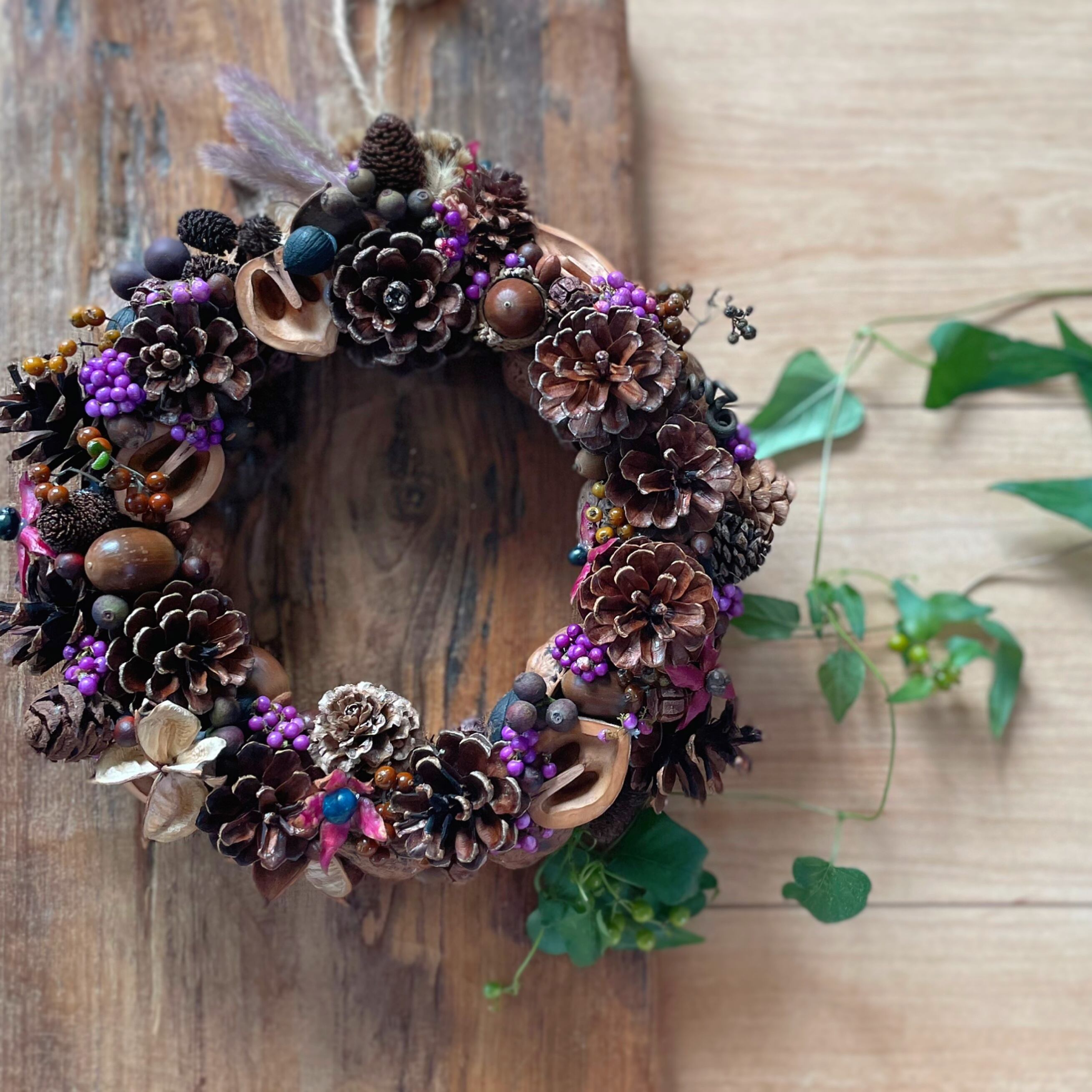作り始めたら、リースがより映えるようにと、木の実やドライフラワーに興味が及び、