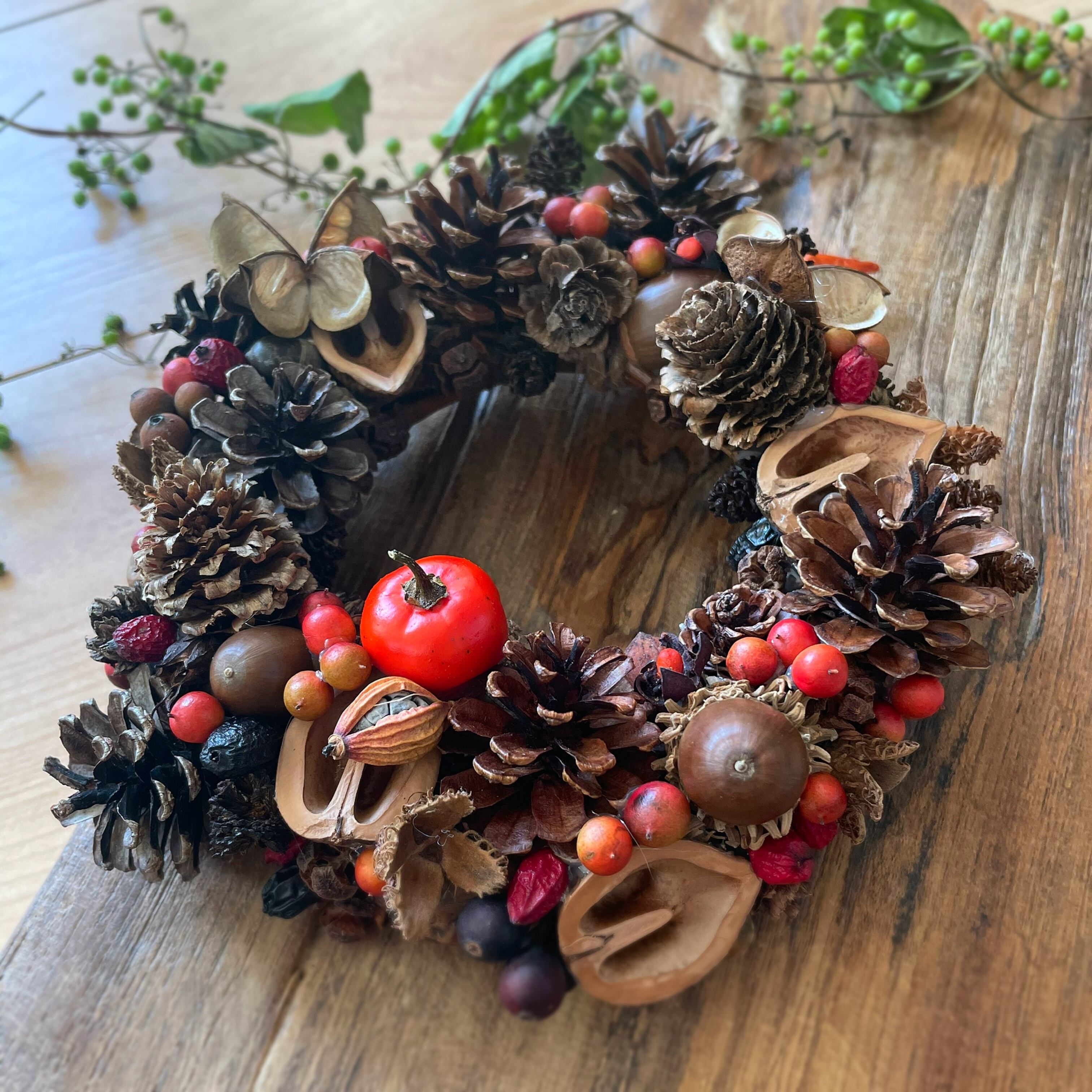リースは、全て自然素材を使用しており、木の実は日に日にドライが進み、色が変化していきます。