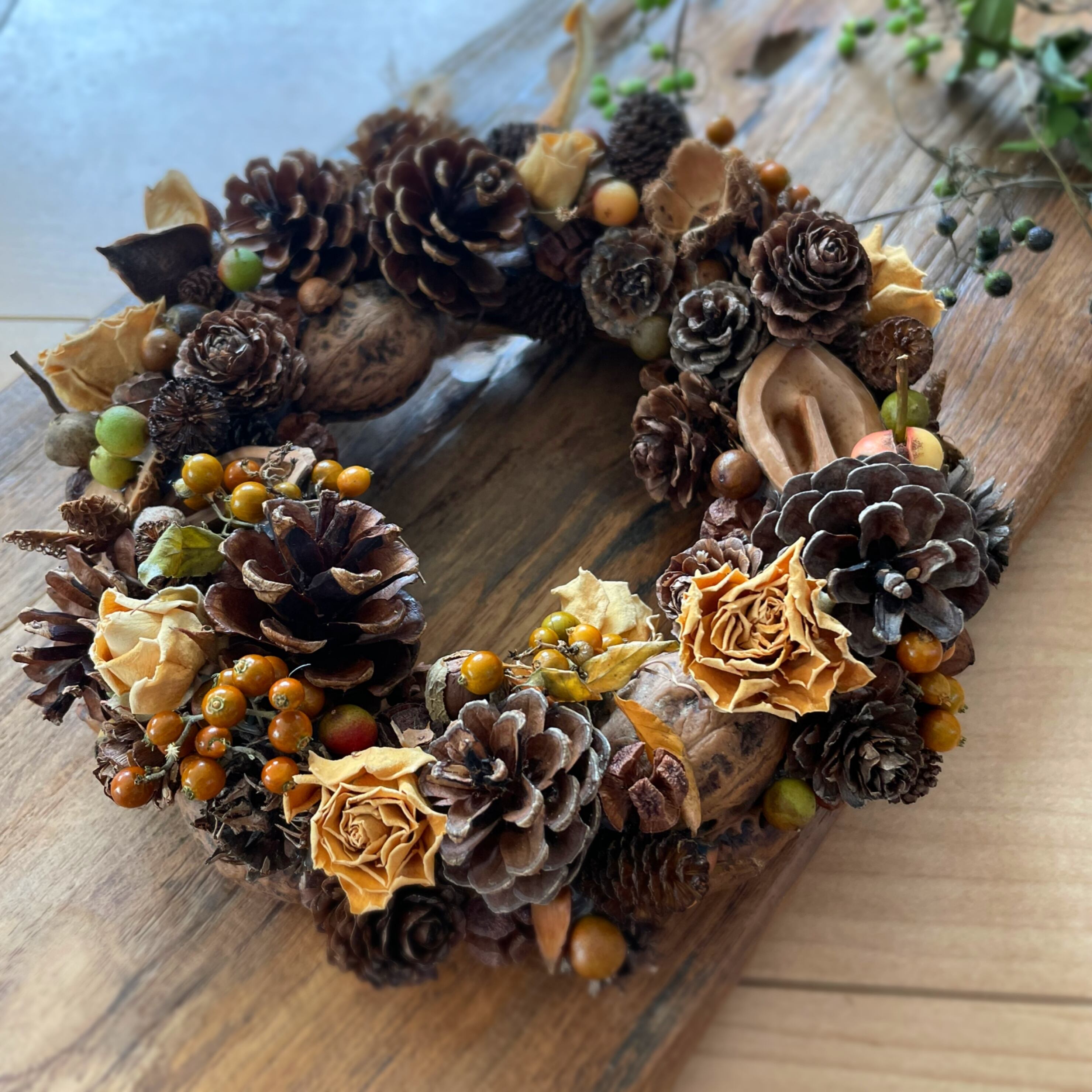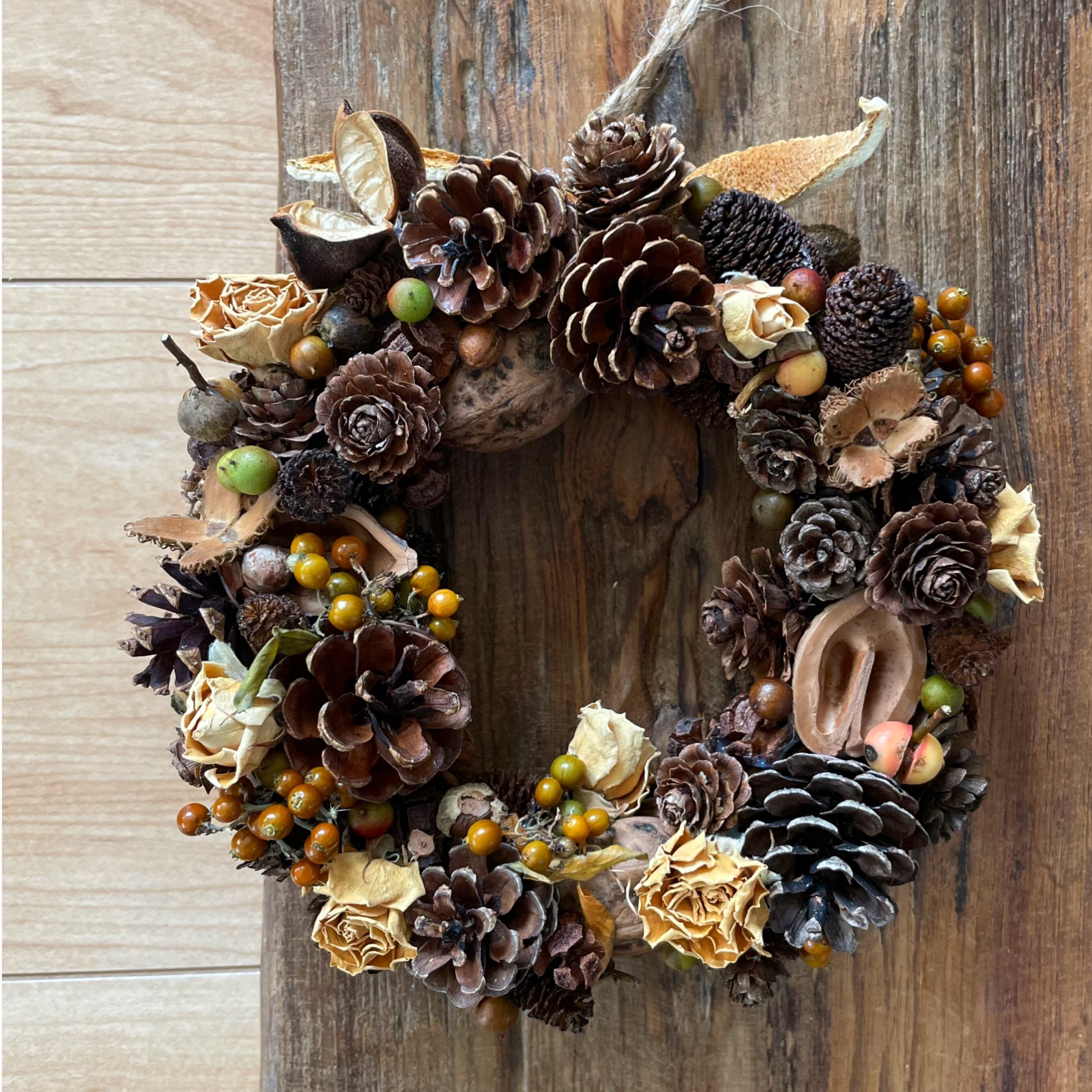 趣味で収集した松ぼっくりが溜まりすぎたことから始めたリース作りですが、ちょっと違う感じも作りたくなり、ついついドライフラワーのお店を覗いたら、ついつい買ってしまい、結局花材は増える一方、、、。