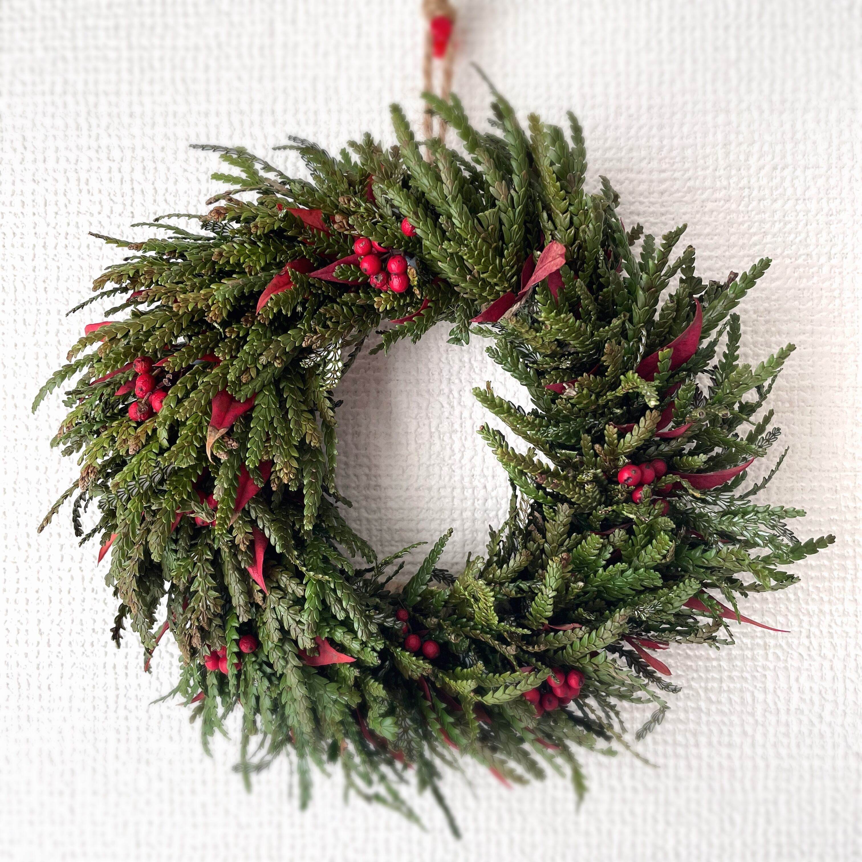 アスナロを中心に、自然素材だけで作ったナチュラルグリーンリースです。