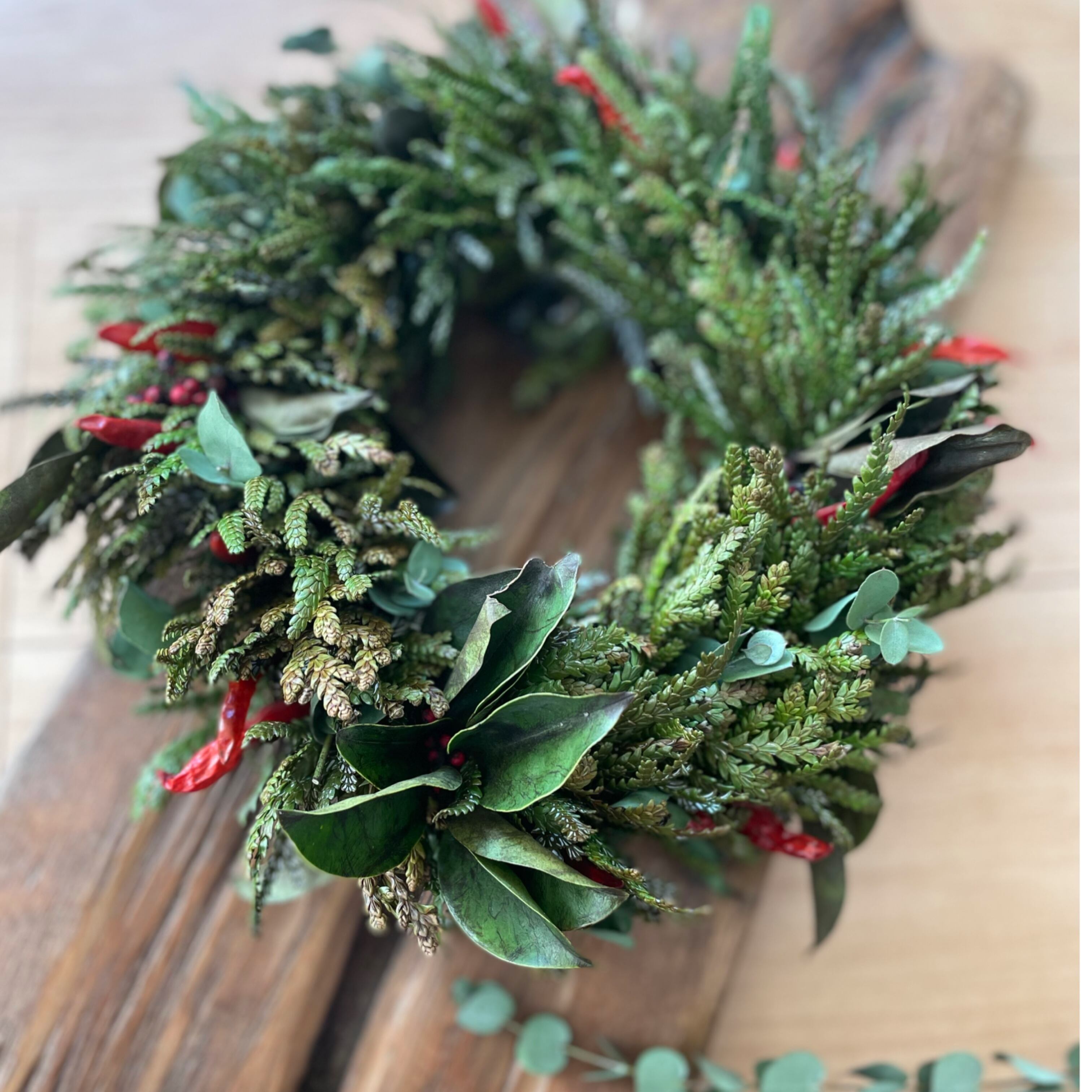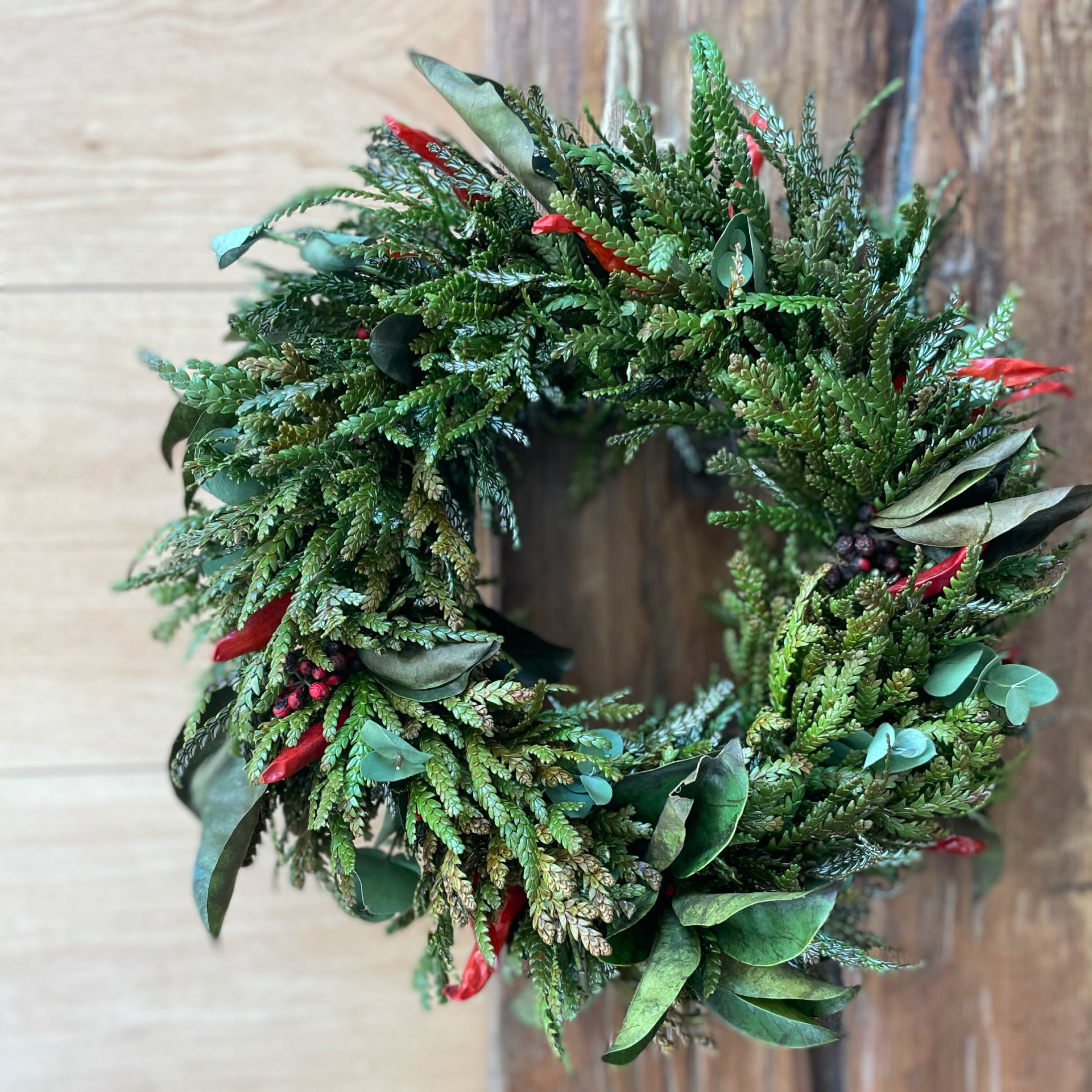 アスナロにユーカリの葉を織り交ぜたグリーンリースに、