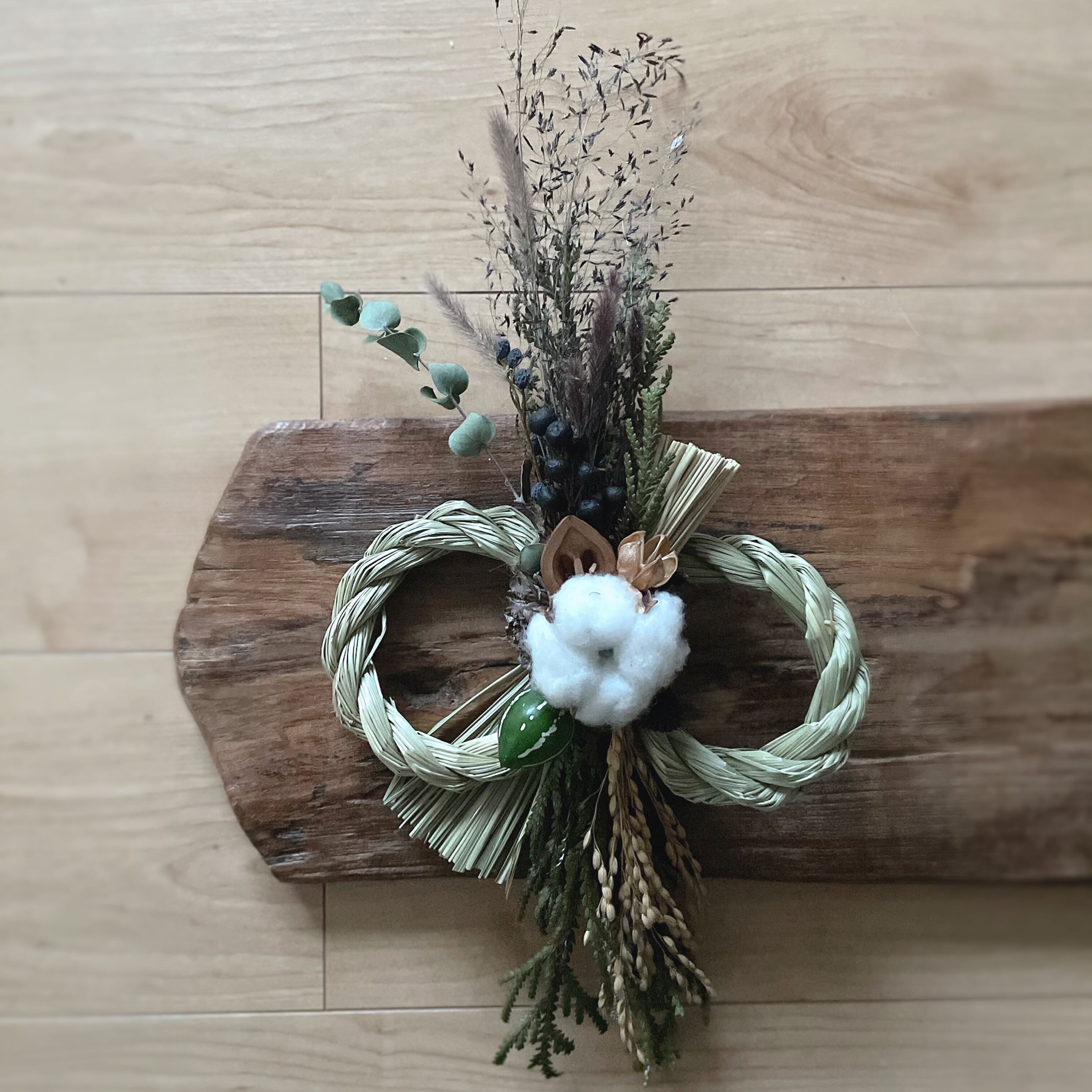 アスナロに、ユーカリと稲穂を織り混ぜ、