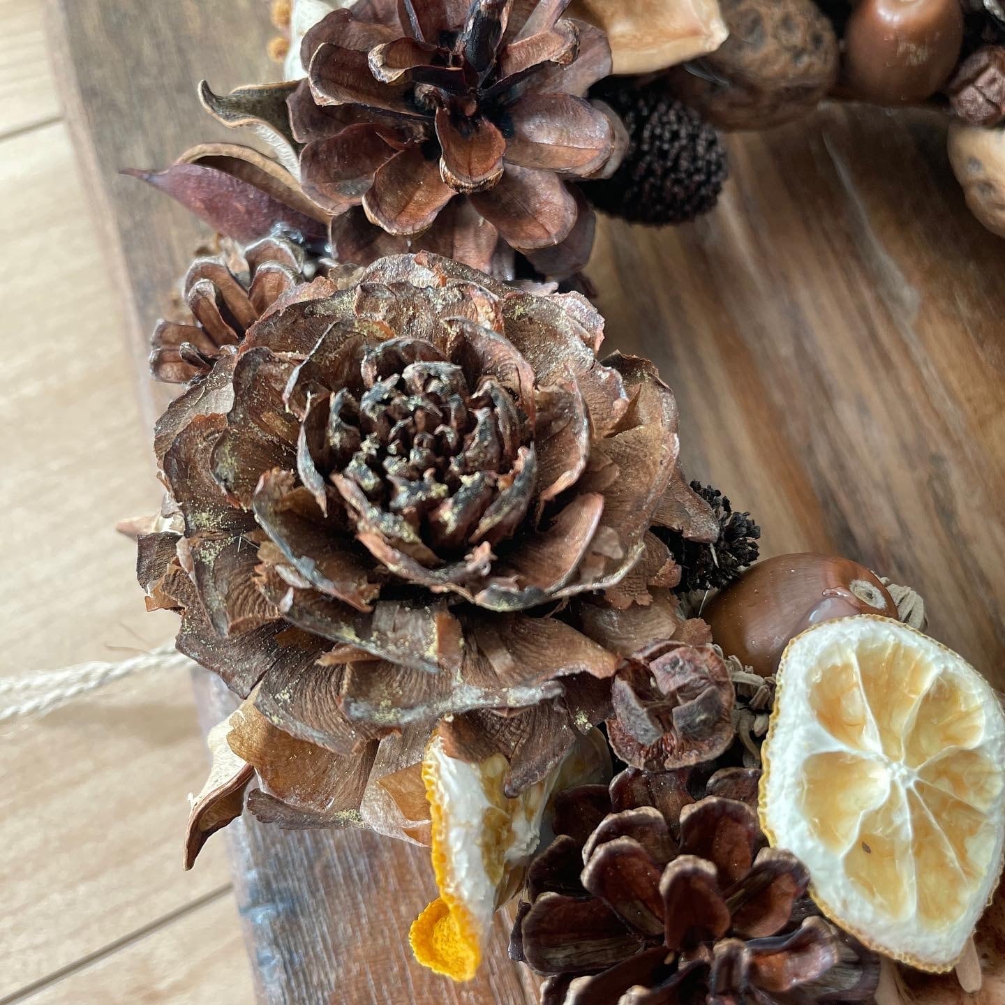 松ぼっくり、クルミなどを中心に、自然素材だけで作ったナチュラルリースです。