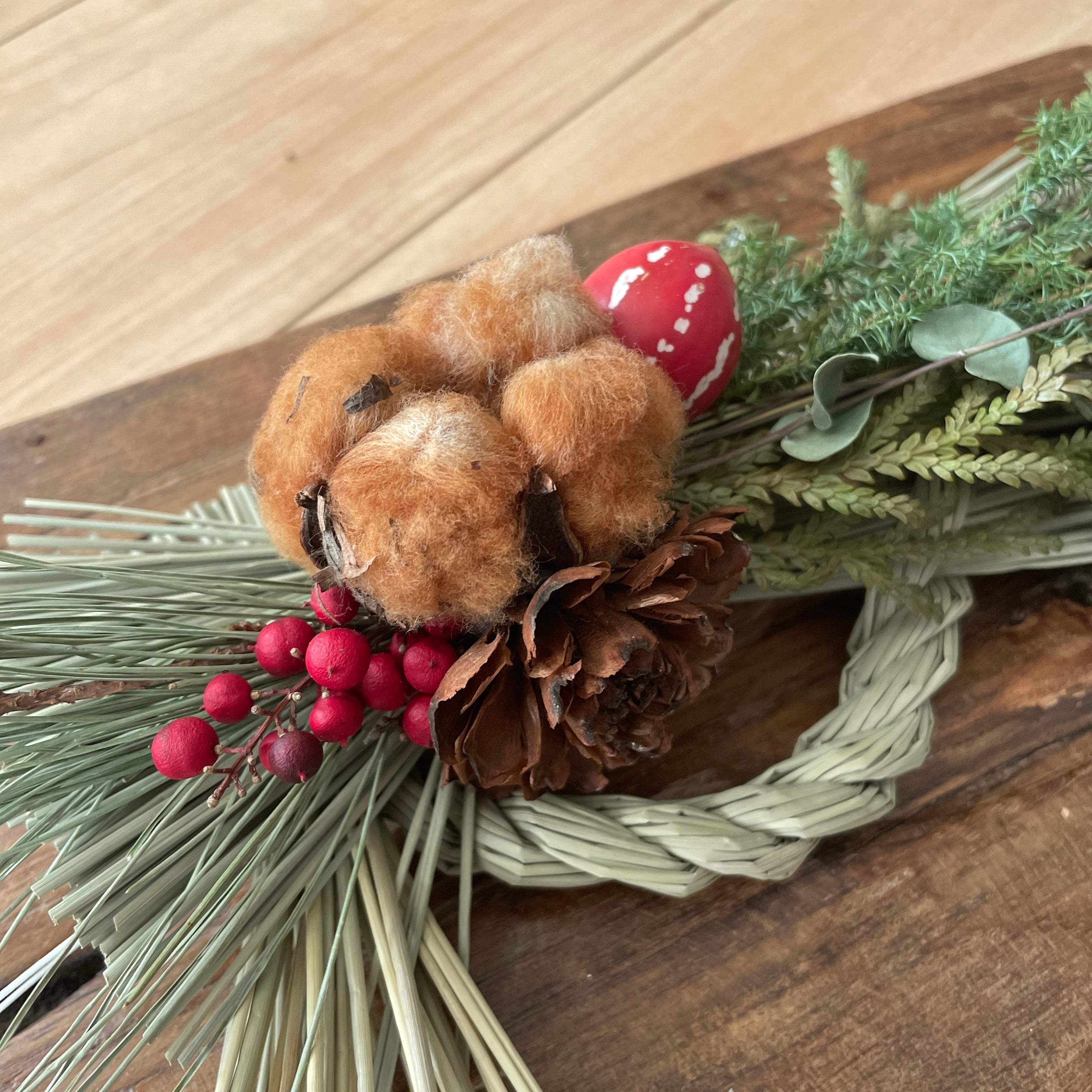 アスナロに、ヒムロスギとユーカリ、稲穂、猫じゃらしを織り混ぜ、赤い南天の実と松の葉でお正月らしく。
