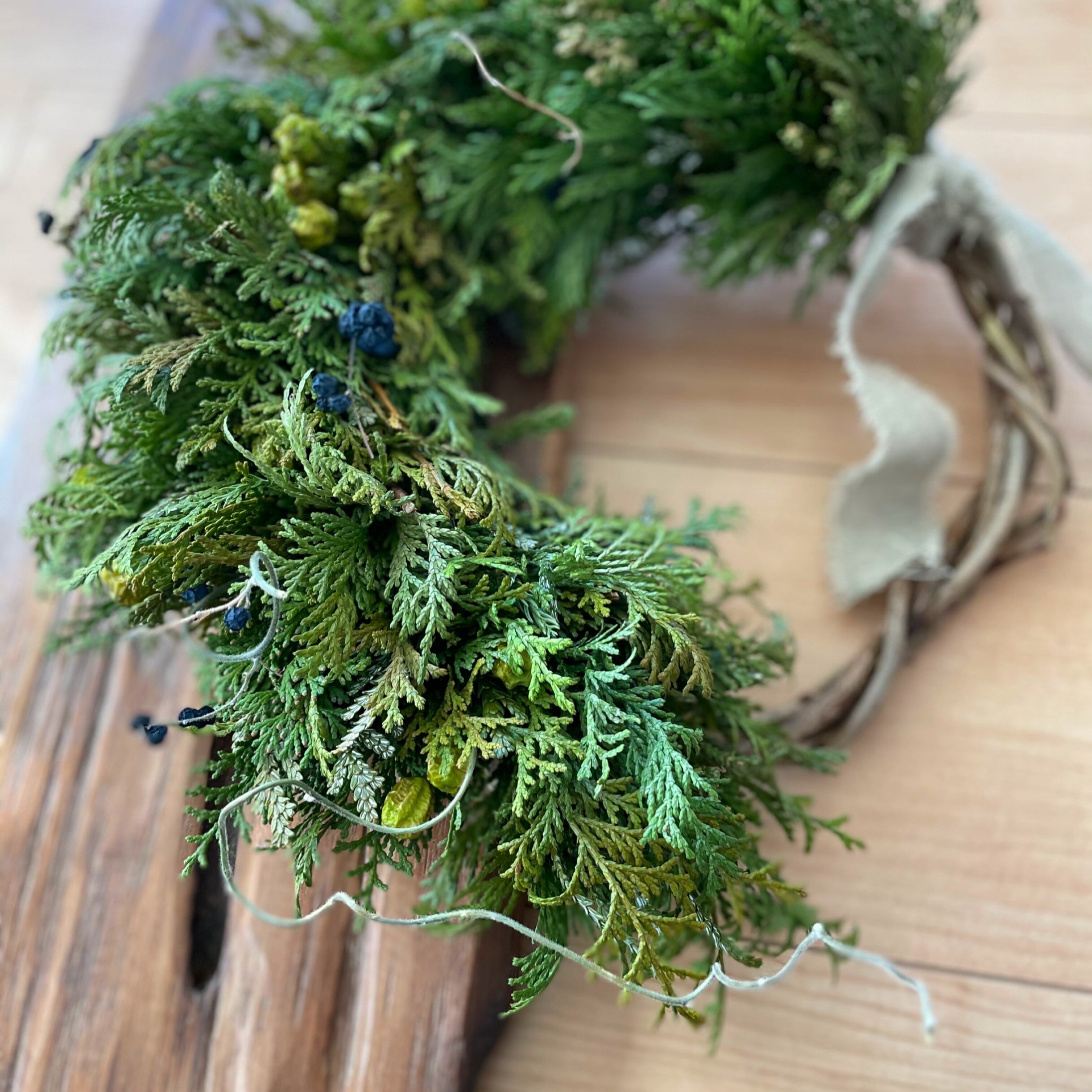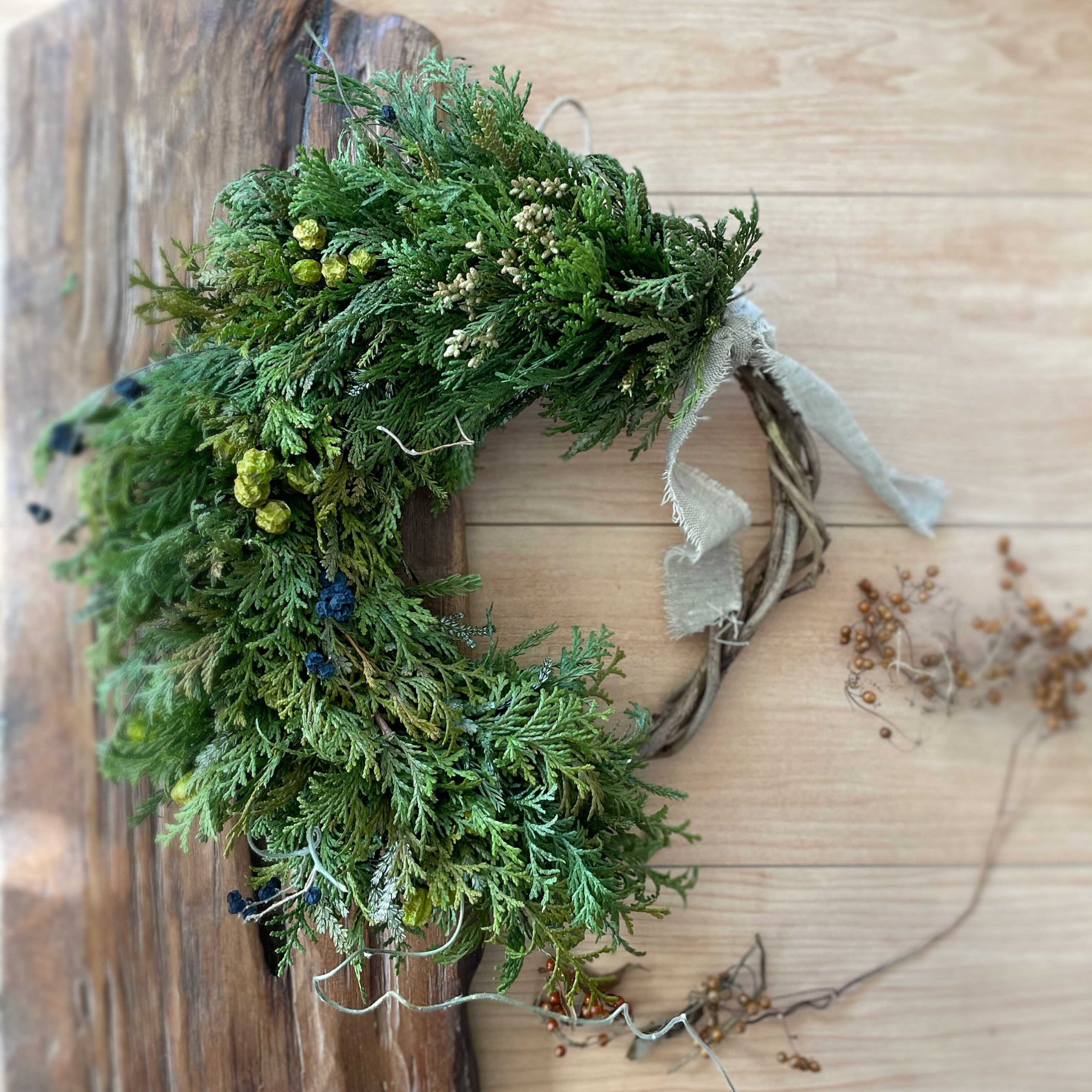 そして、乾燥もアスナロよりも早く、リースにしてエアコンのある室内に置いておくと、2週間ほどでドライになり、香りもさらに微かになります。
