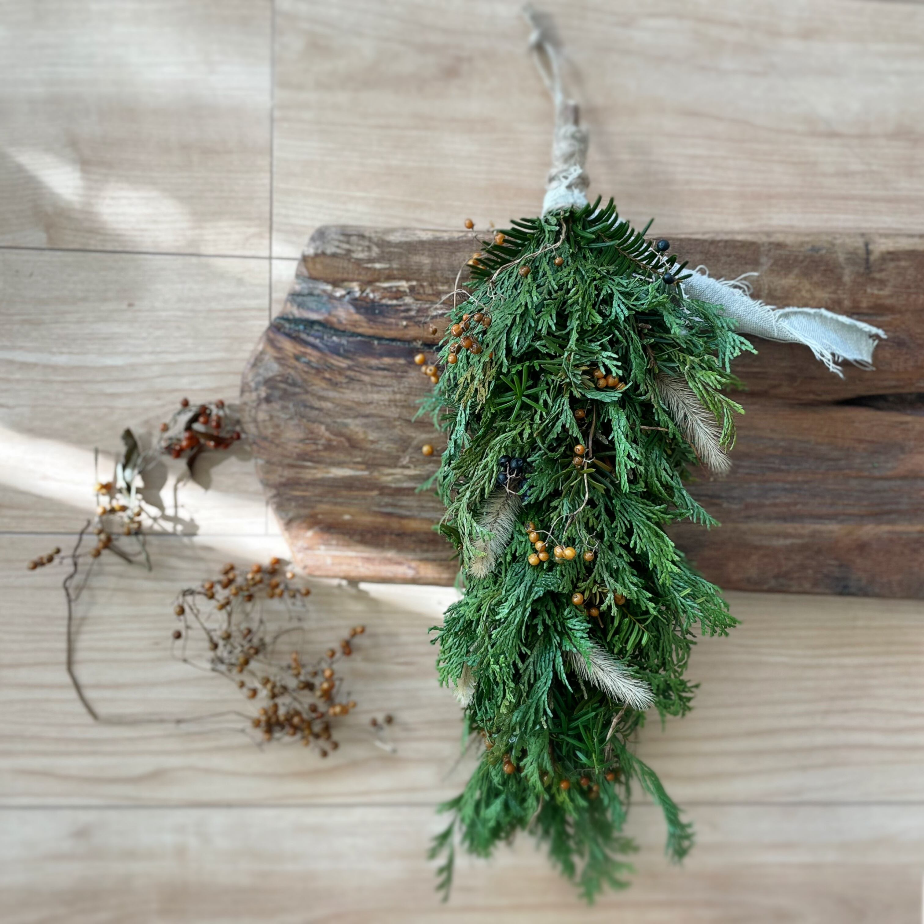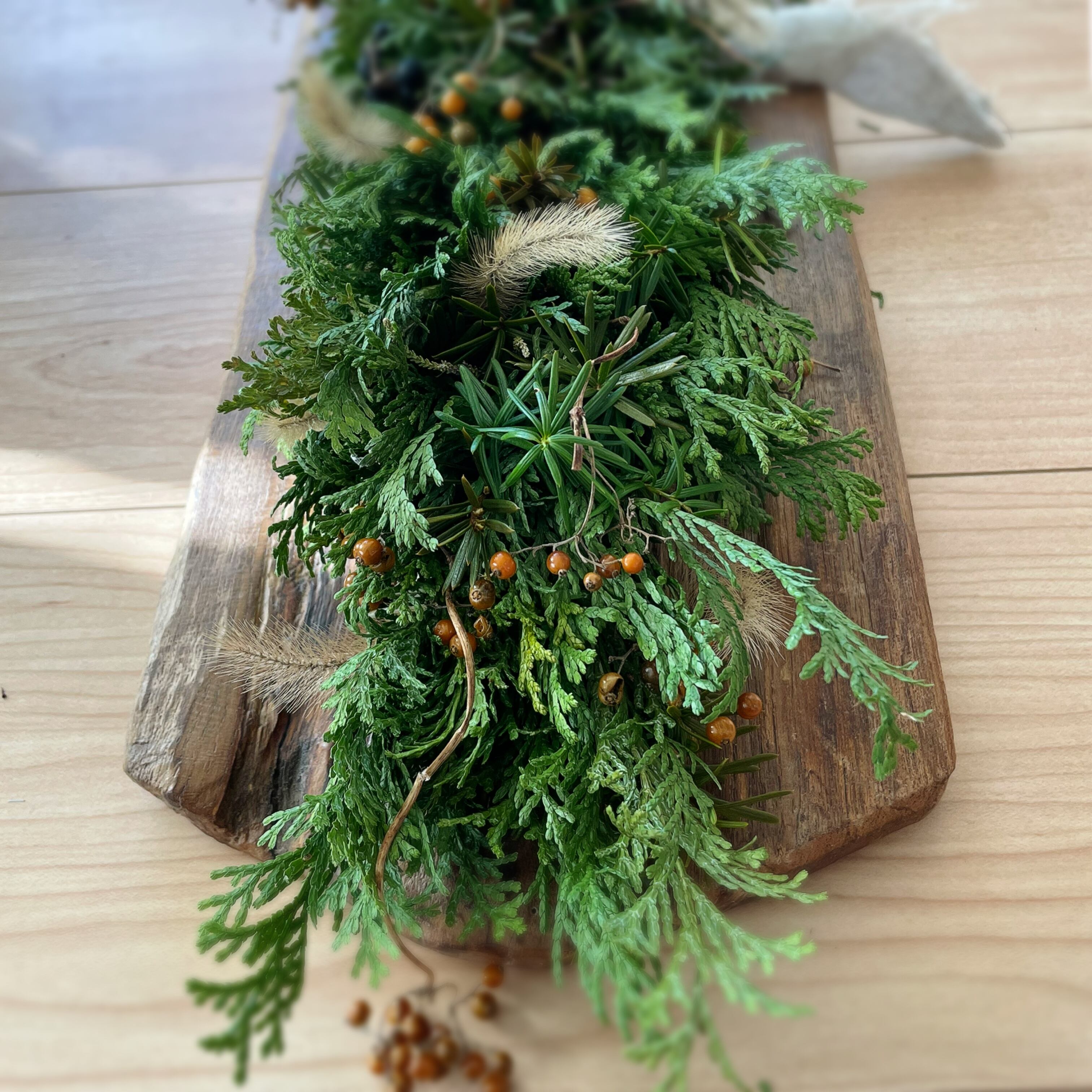 自然素材だけで作ったナチュラルグリーンスワッグです。