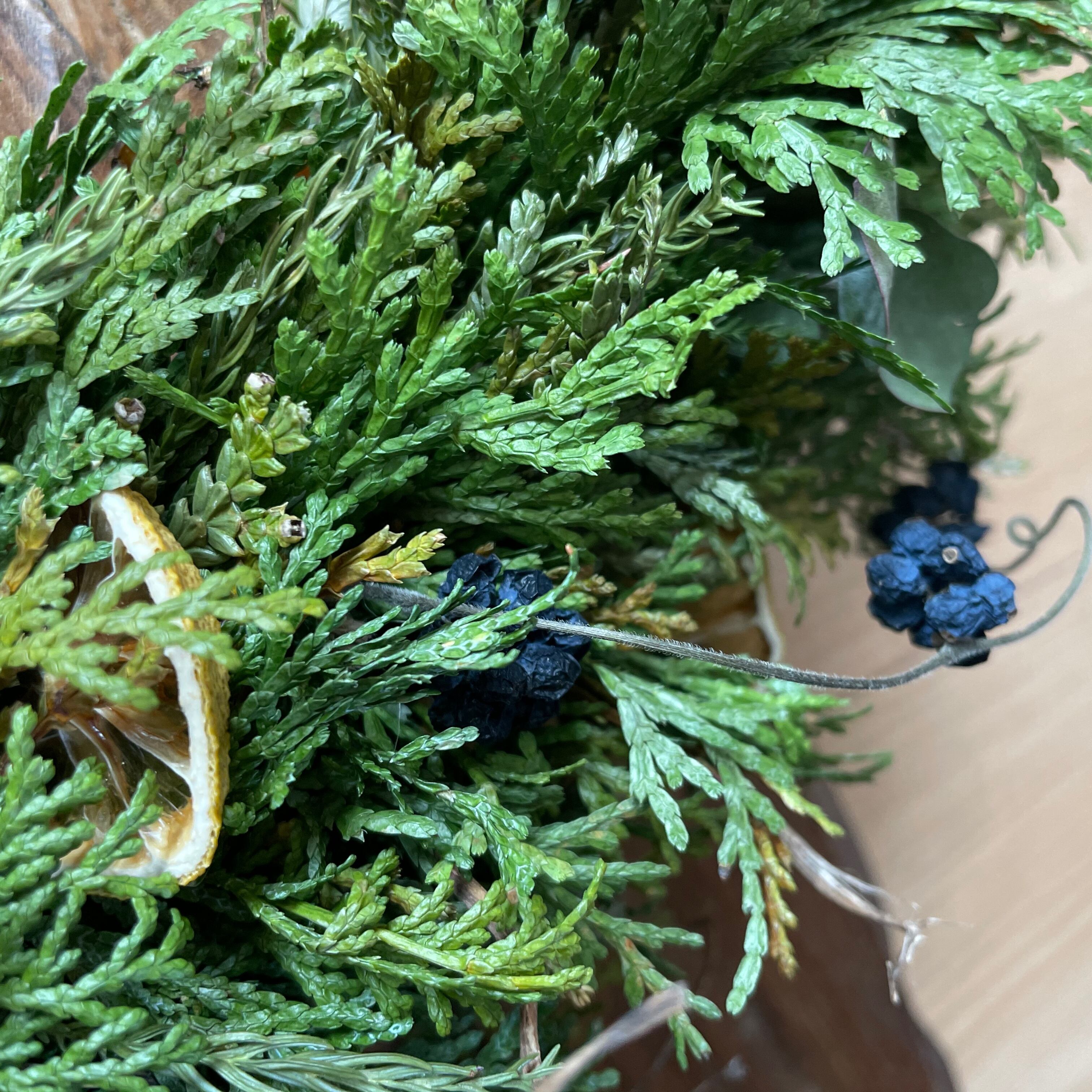 メインで使ったのは、ヒノキとアスナロとスギ。そこにユーカリを織り混ぜて。ヘクソカズラや紺色になった木の実の蔓の動きを活かして作りました。アクセントに、ドライレモン。