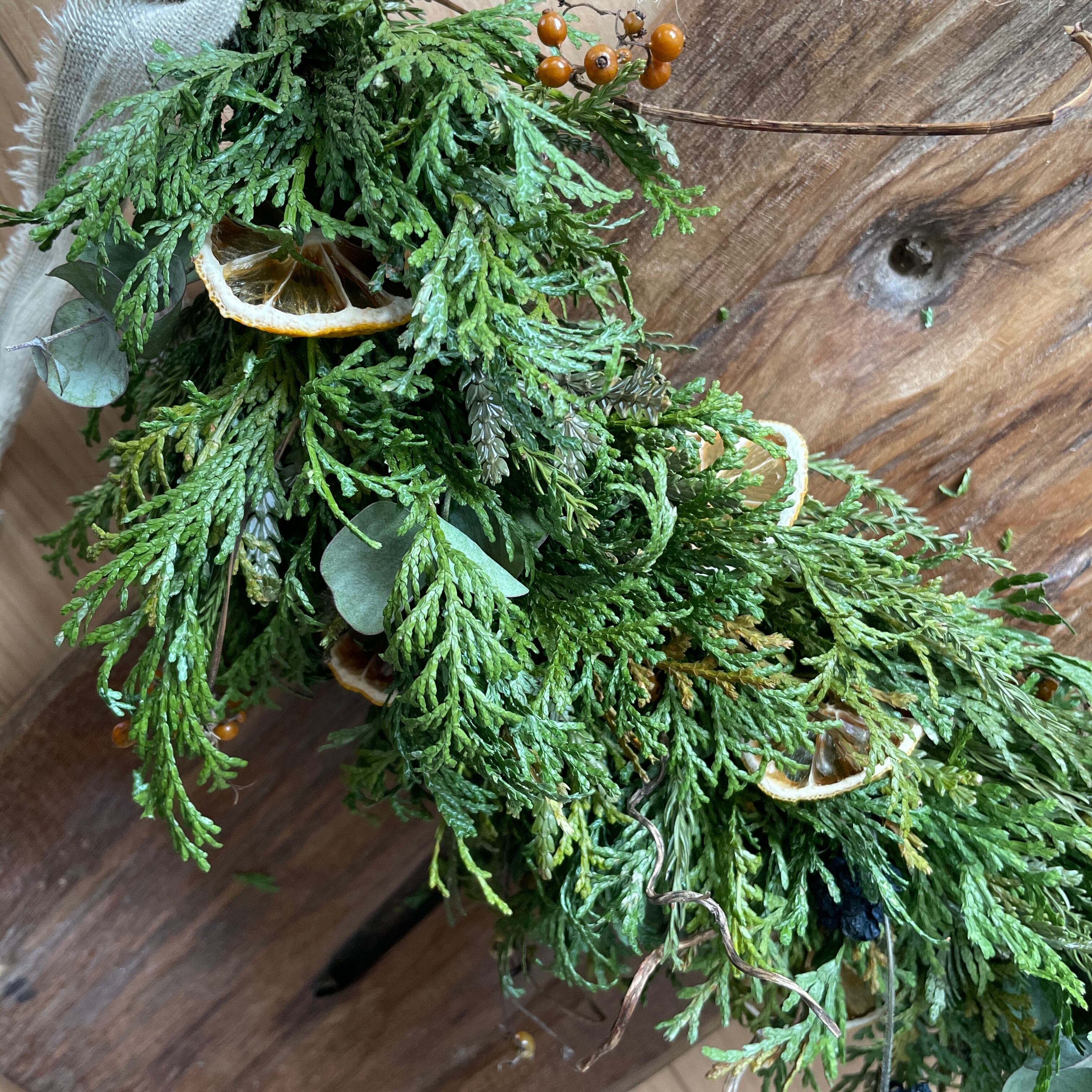 長めの枝に、短くカットした針葉樹や木の実を巻き付けて作っているので、真っ直ぐなリースという方がいいでしょうか?