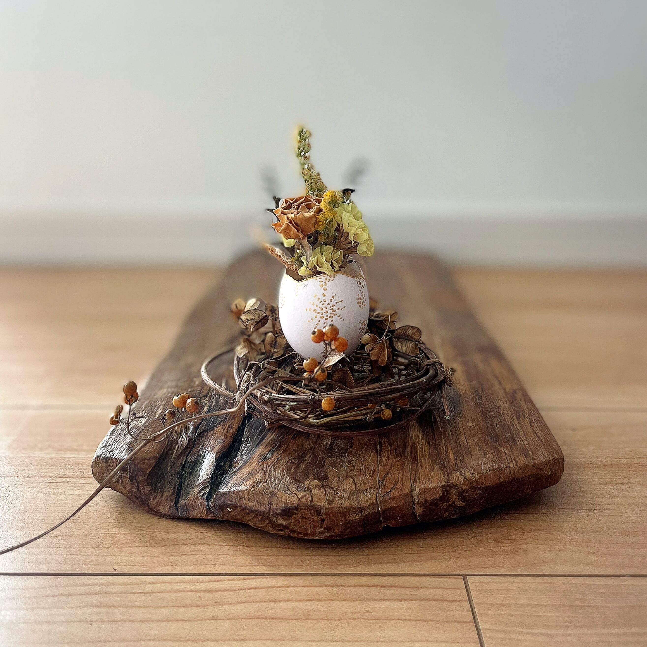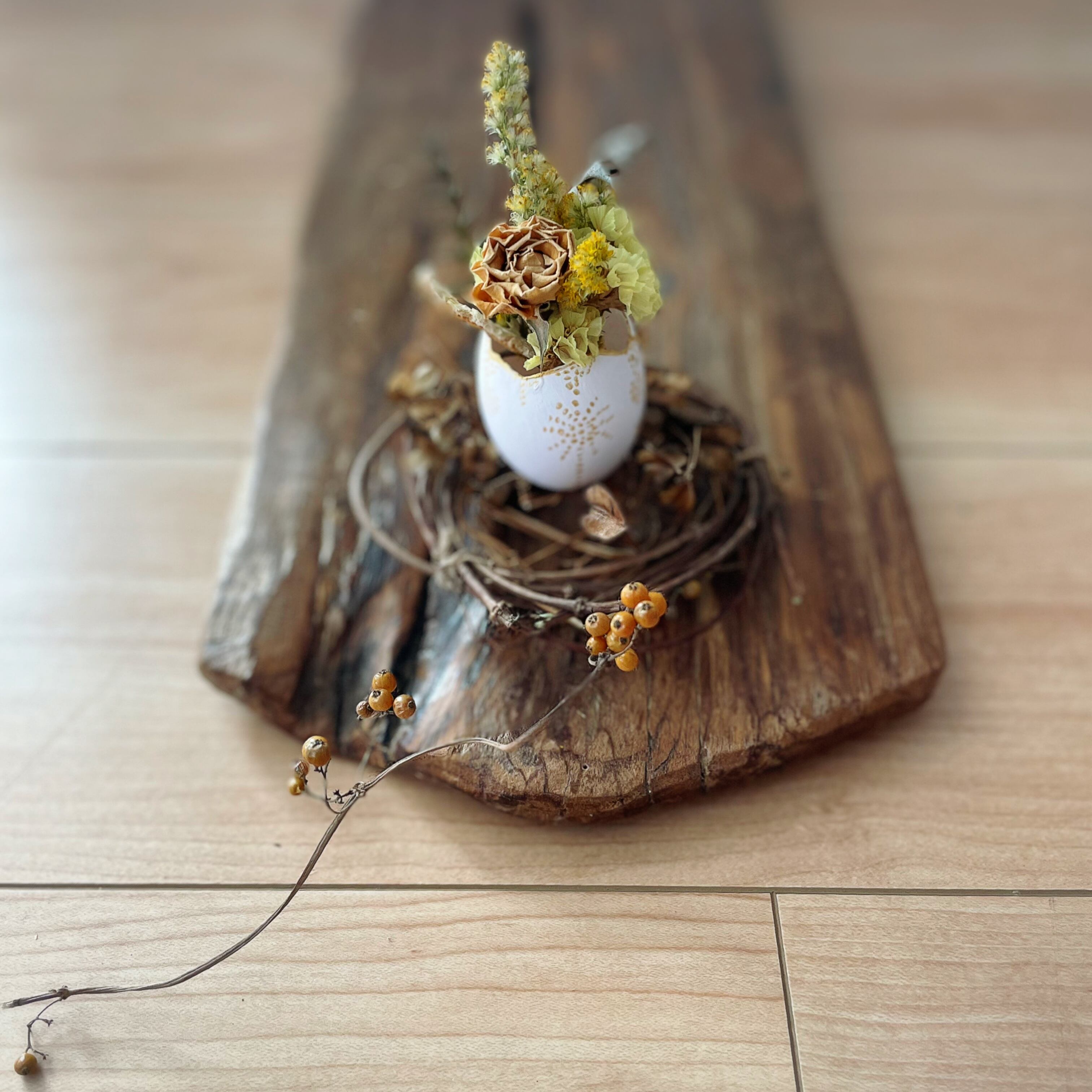 ヘクソカズラなどの蔓で作った鳥の巣に、たまごを乗せた、小さなドライフラワーのアレンジメントです。