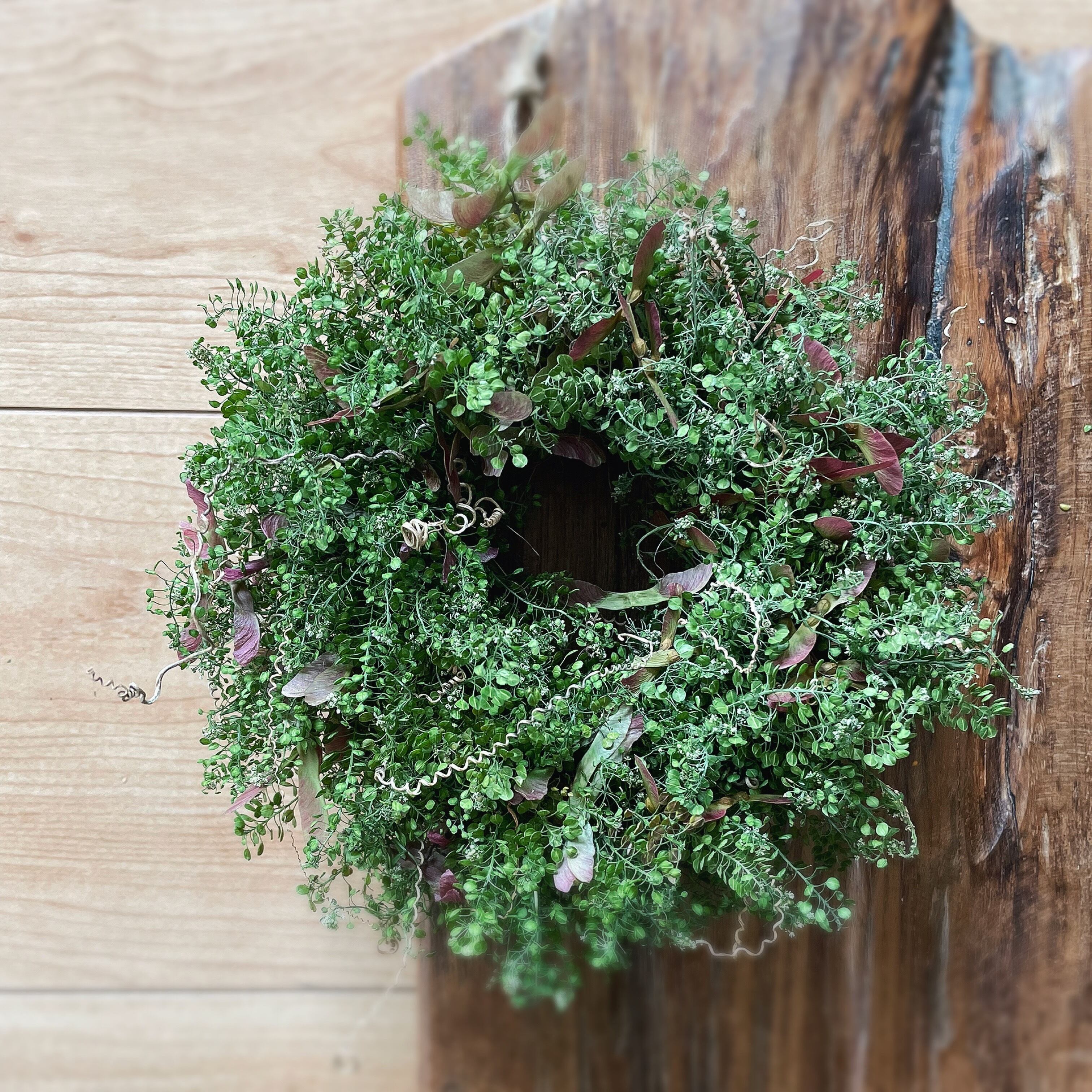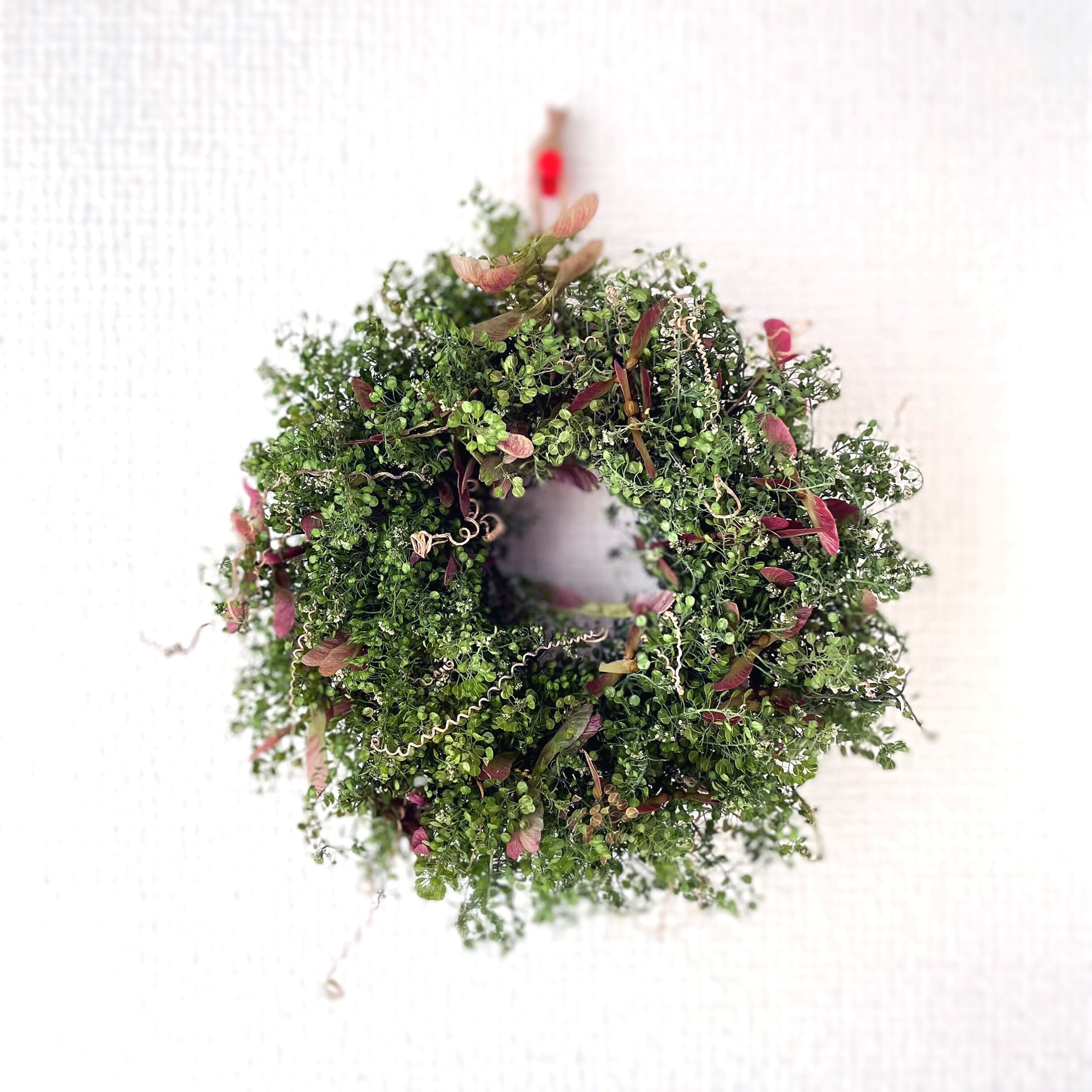 豆軍配ナズナを中心に、ヘリコプターのような紅葉のタネ、くるくるの小さな蔓を織り交ぜて、小さなリースにしました。