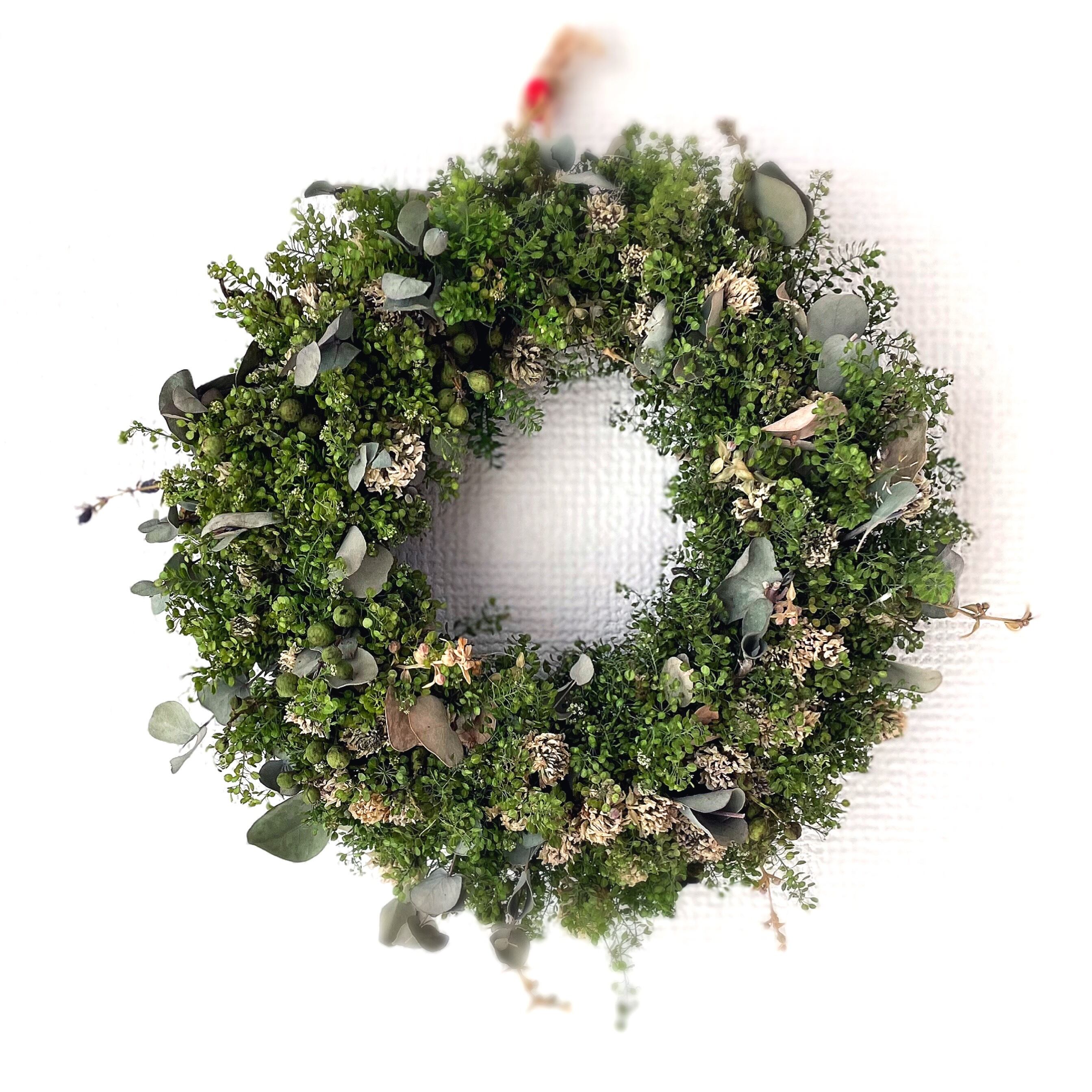 豆軍配ナズナを中心に作ったドライフラワーのグリーンリース、直径22cm程度です。