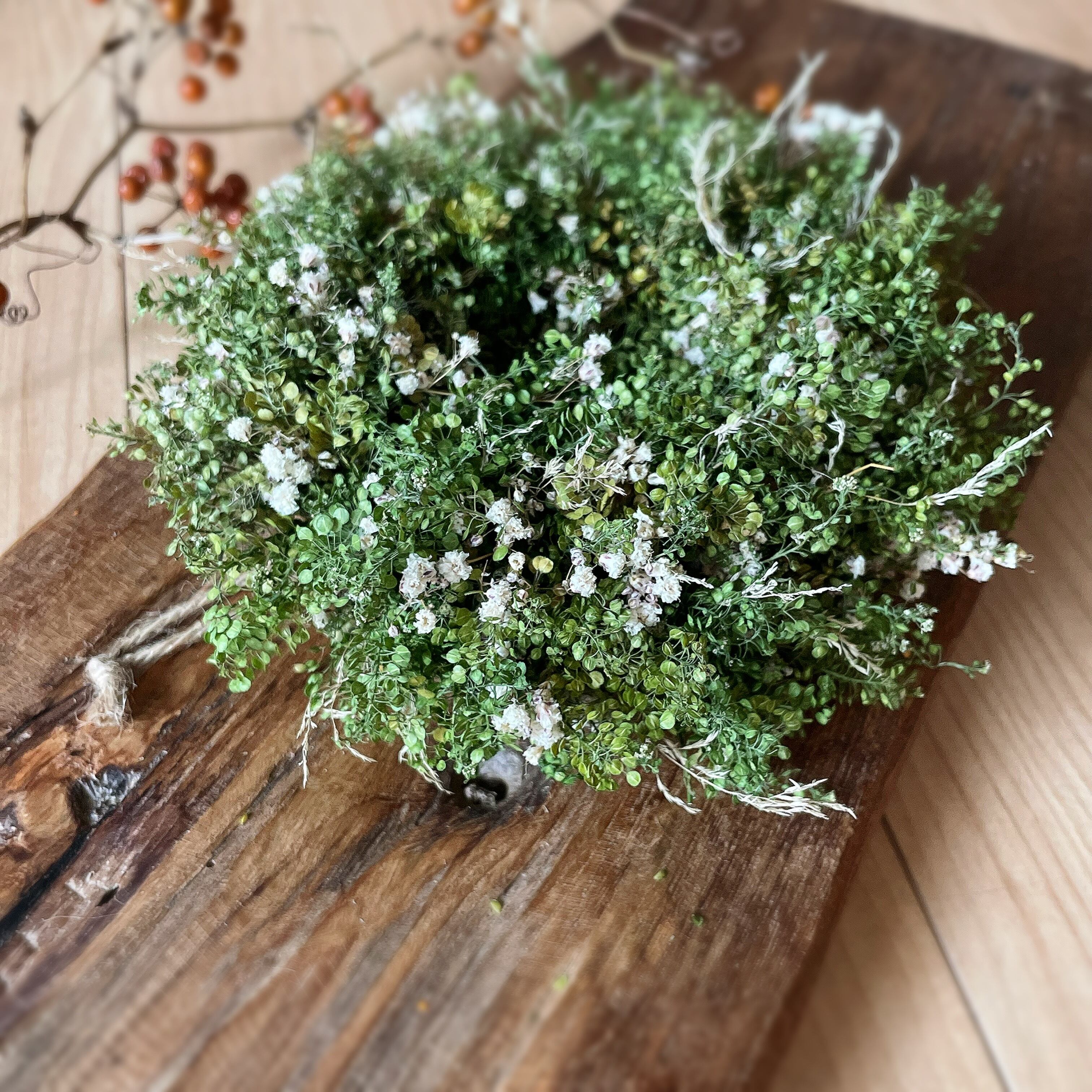 豆軍配ナズナを中心に作ったドライフラワーのグリーンリース、直径15cm程度のミニサイズです。