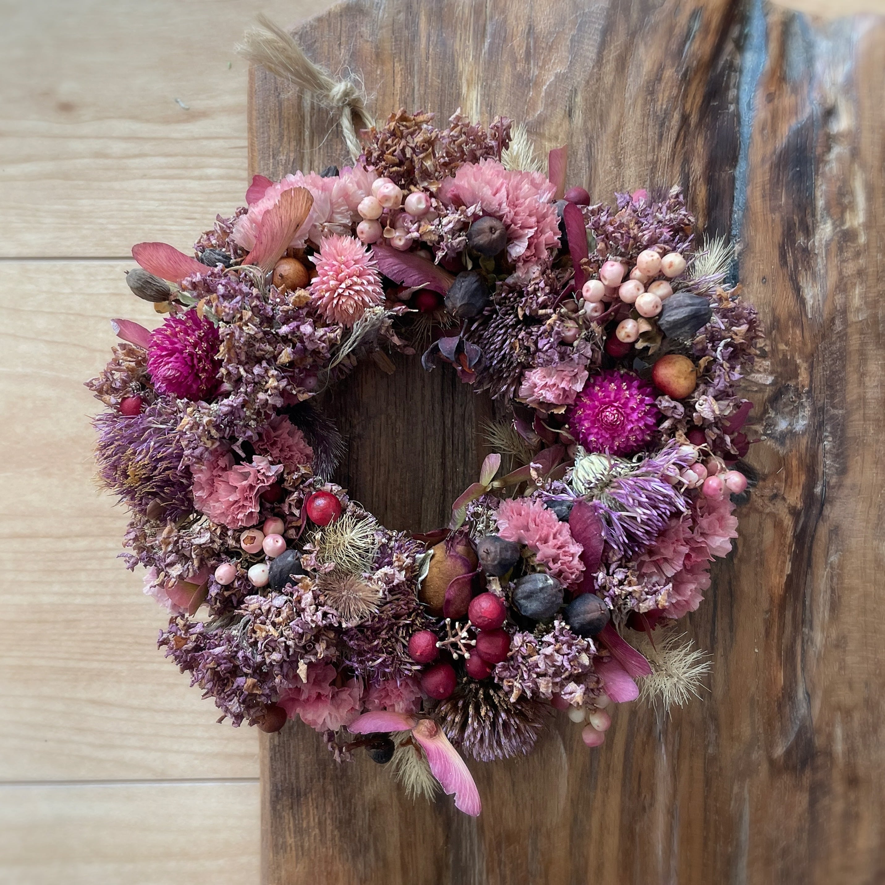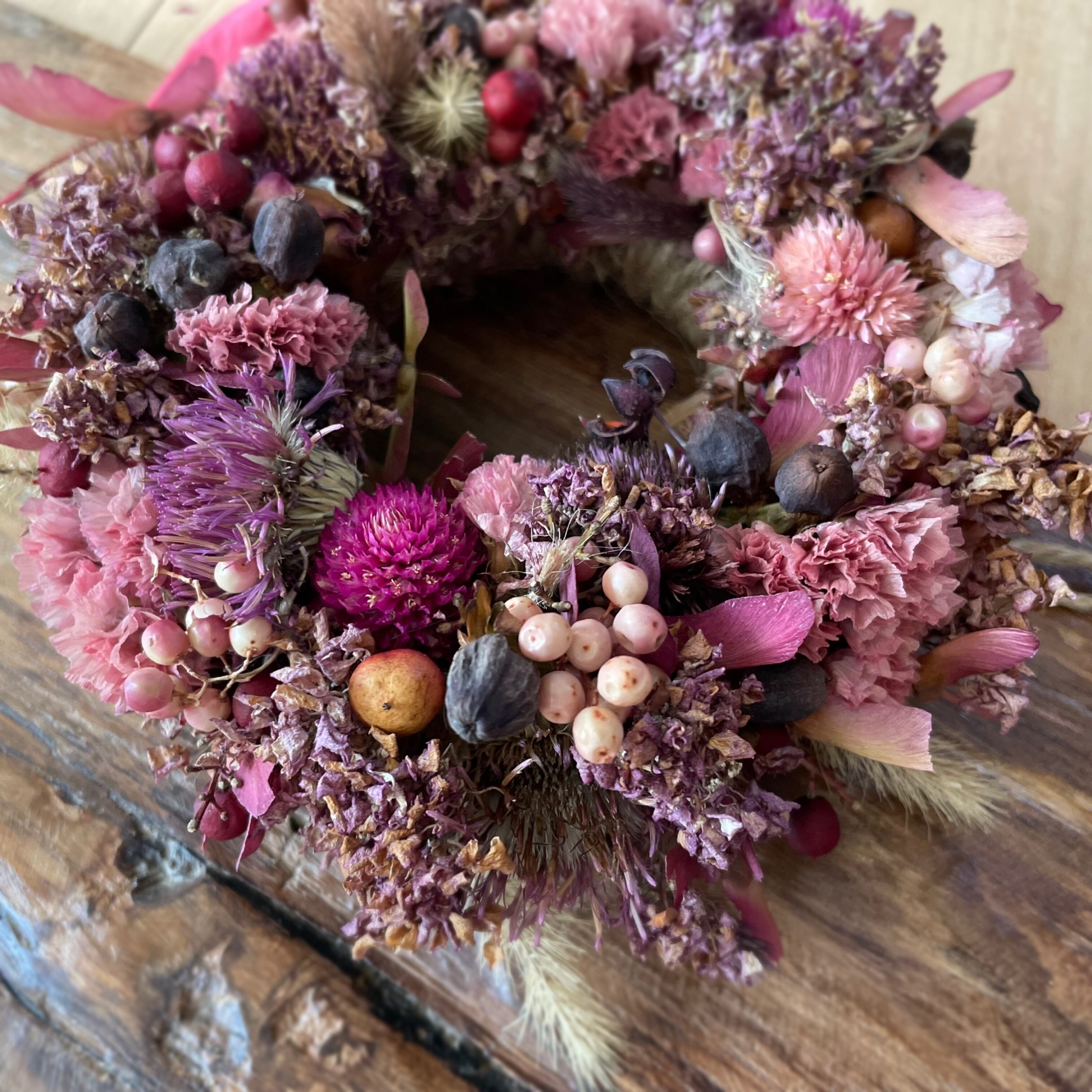 こちらは、スターチスを中心に、アザミやペッパーベリー、南天などを織り交ぜ、レンガ色にまとめた小さなリース。