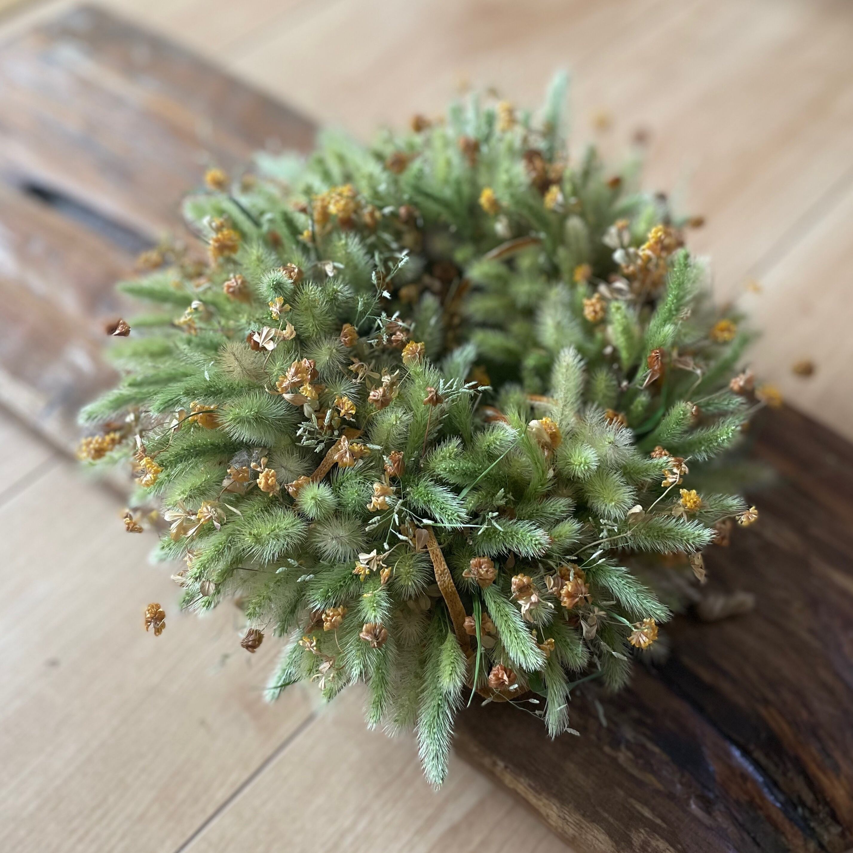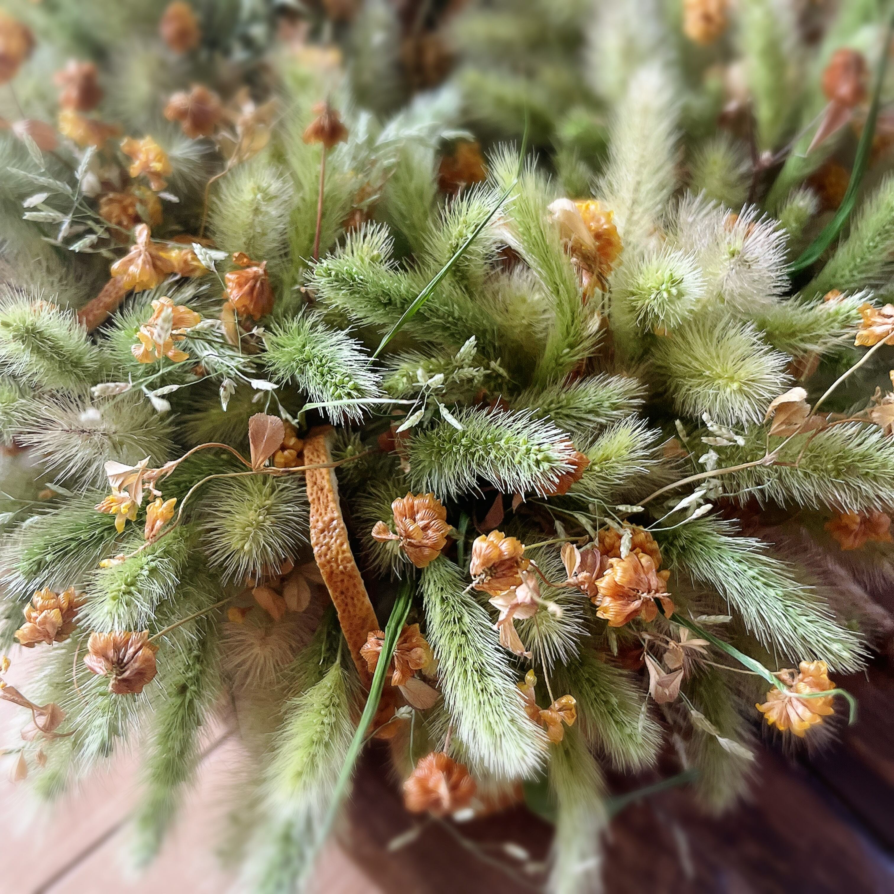 ドライが進むと、猫じゃらしのグリーンは徐々に黄色っぽくなっていきますが、それはそれでお楽しみいただけると思います。自然の素材ですので、変化も含め、お楽しみください。