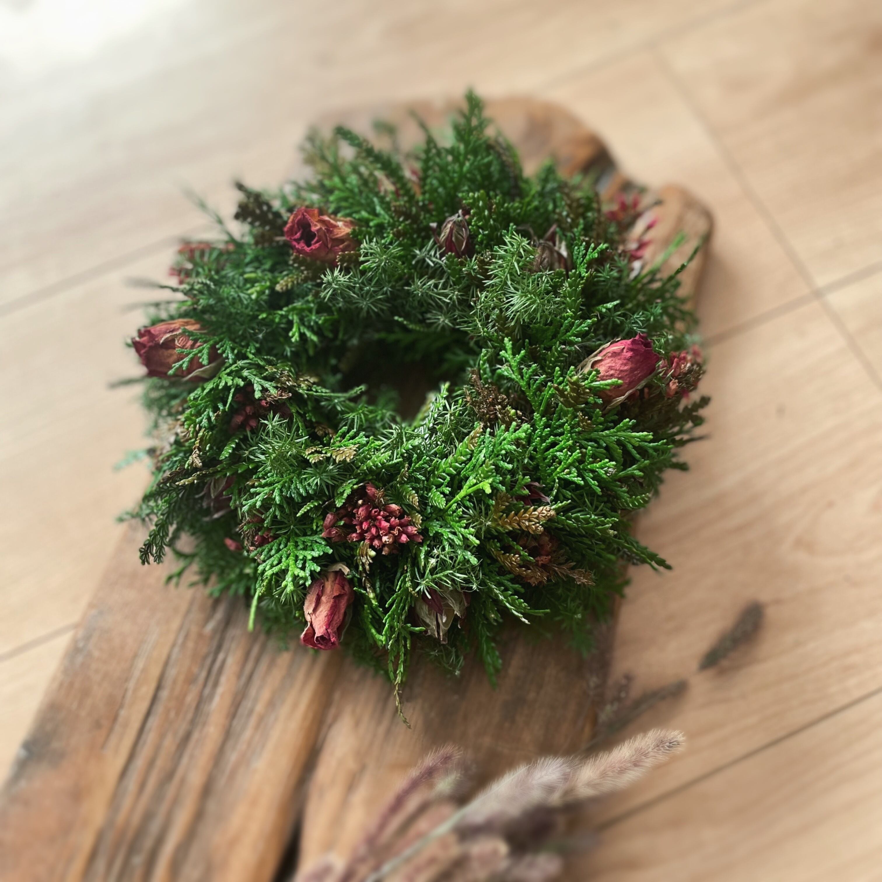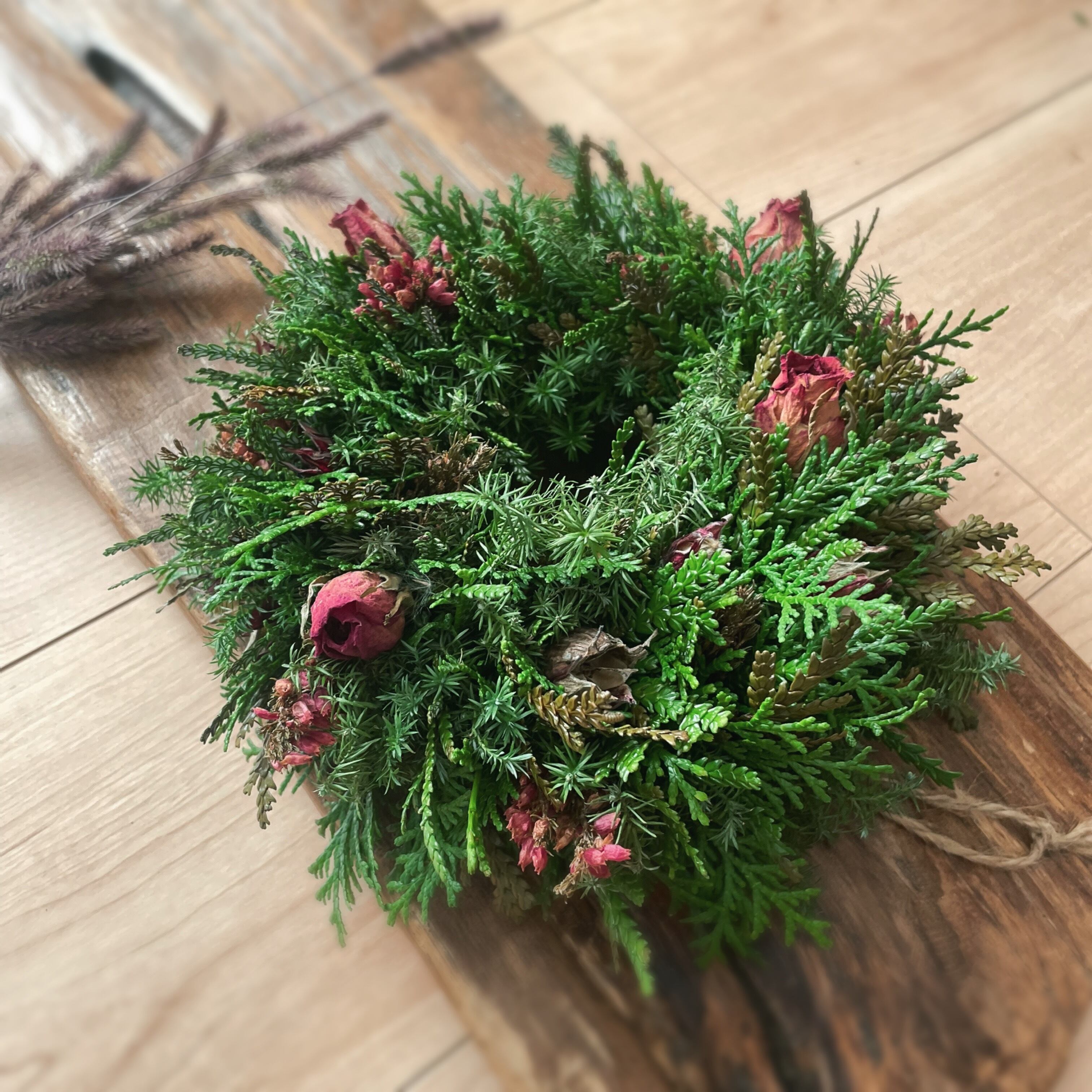 バラ、ローゼルなど渋めの赤系のドライフラワーを織り交ぜて。