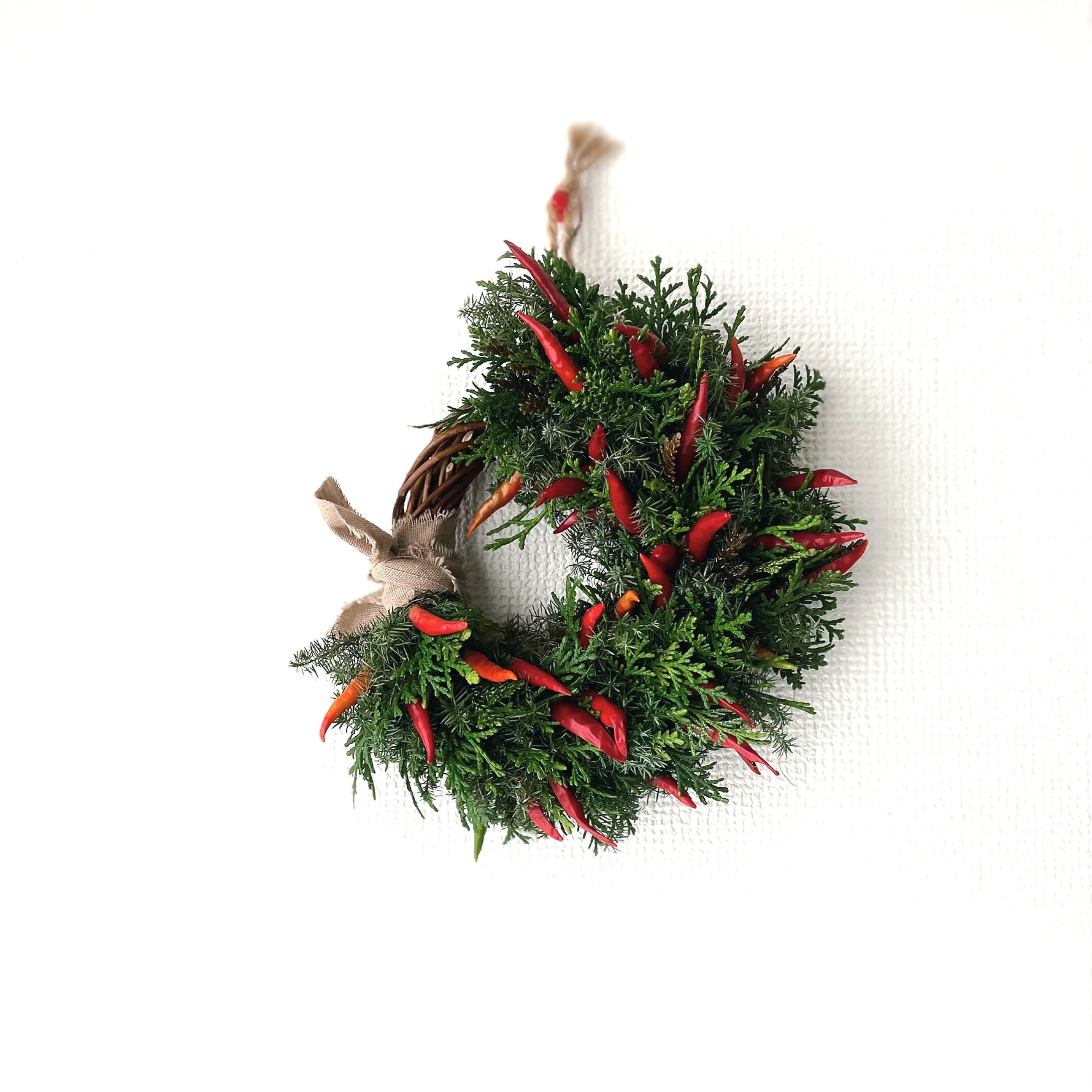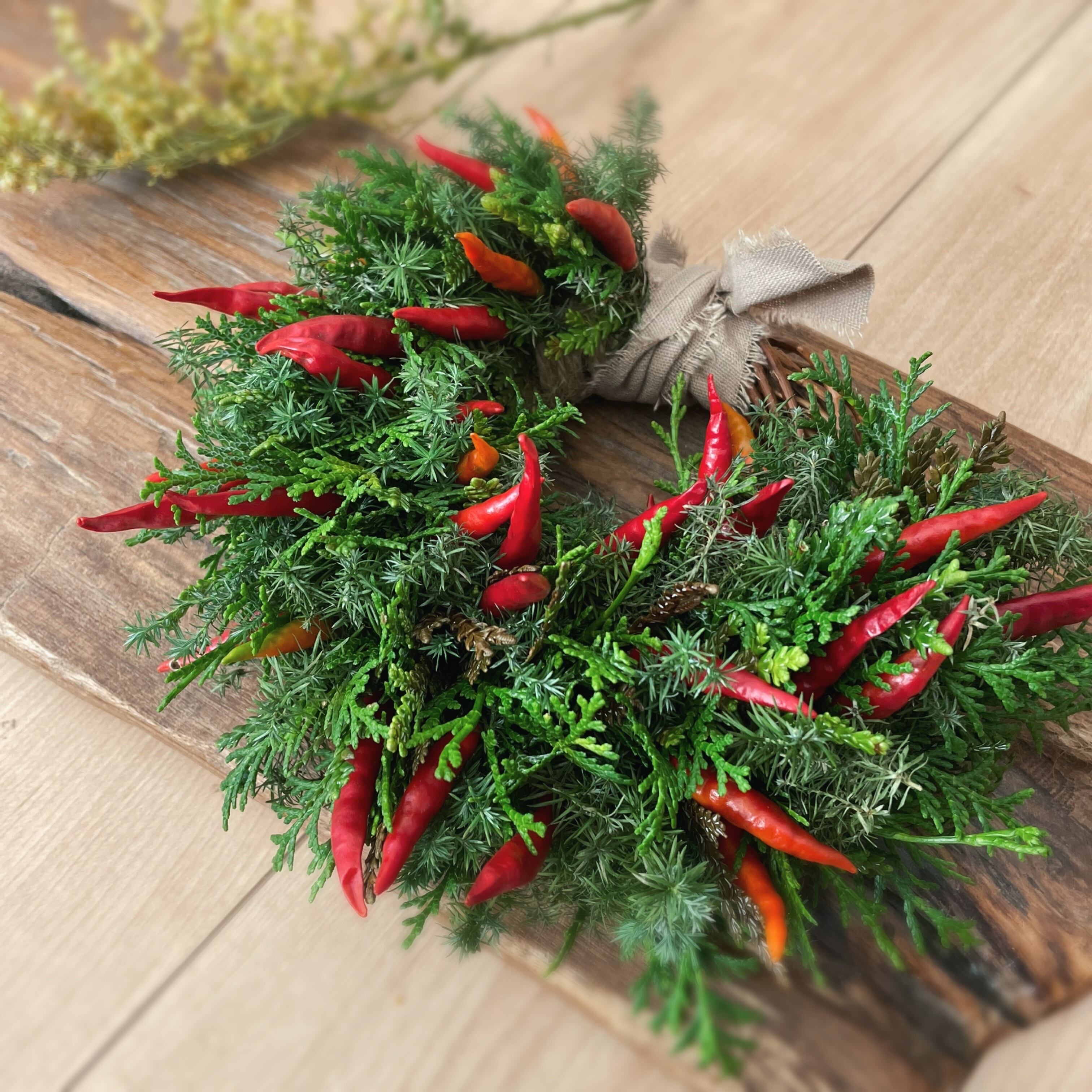 ヒムロスギ、ひのき、アスナロ、たっぷりの針葉樹とともに鮮やかに赤い鷹の爪をぐるぐる束ねました。