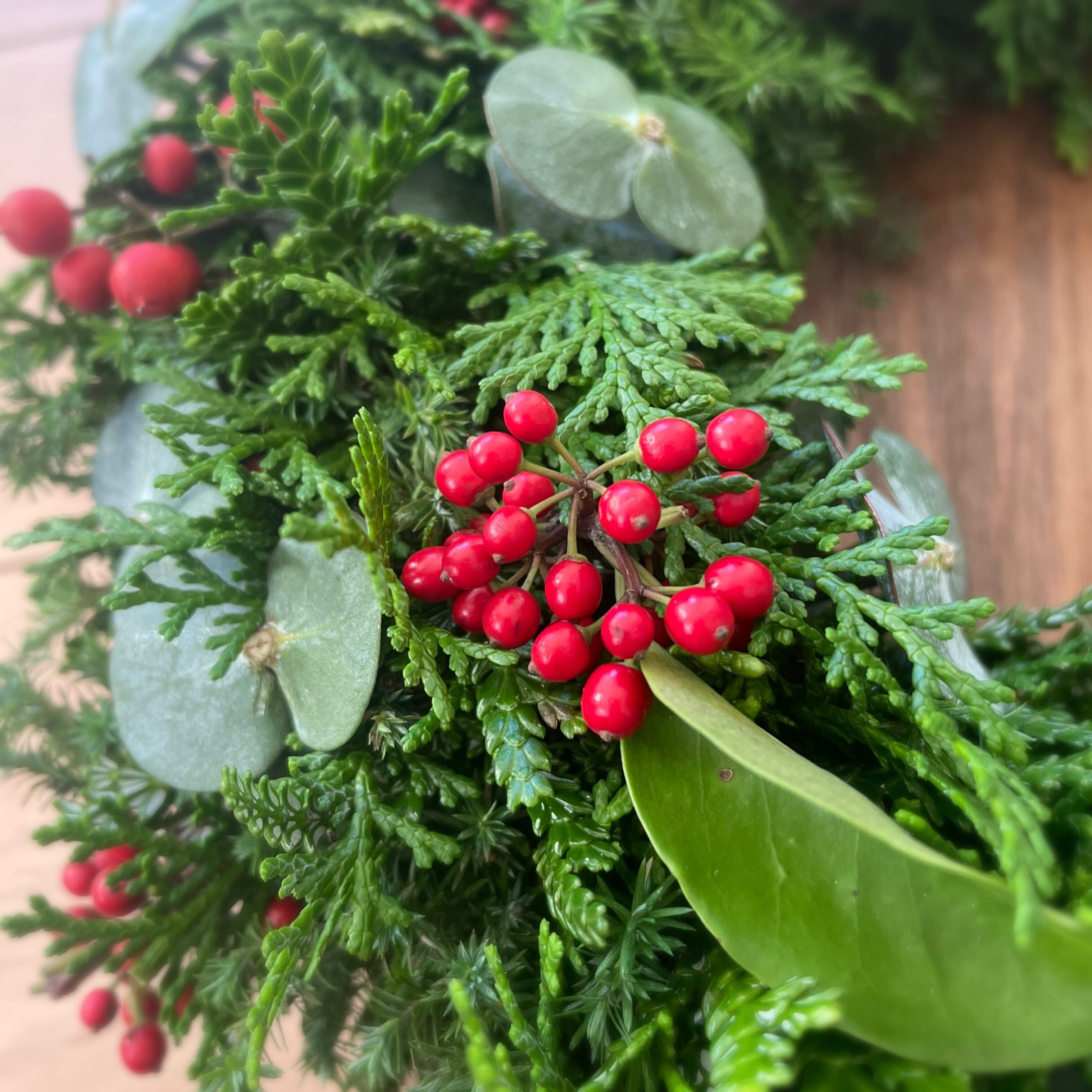 ヒムロスギ、ひのき、アスナロをたっぷりと。そこに、大きめの葉のユーカリを織り交ぜ、真っ赤な南天とクロガネホーリーの実、アオツヅラフジの深い紺色の実を散りばめて。