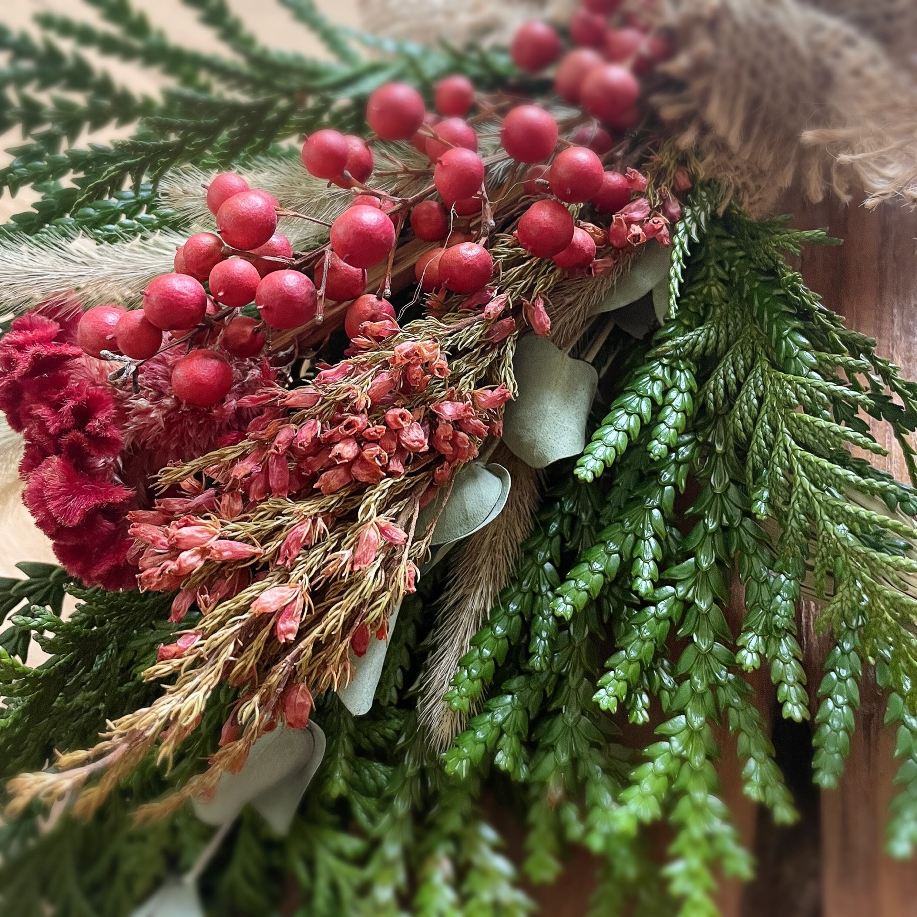 なので、クリスマスからお正月明けまで飾ってもおかしくないように、少しリースっぽく、和でも洋でもなく、そして、お正月が過ぎてもスワッグとしても飾れるように。