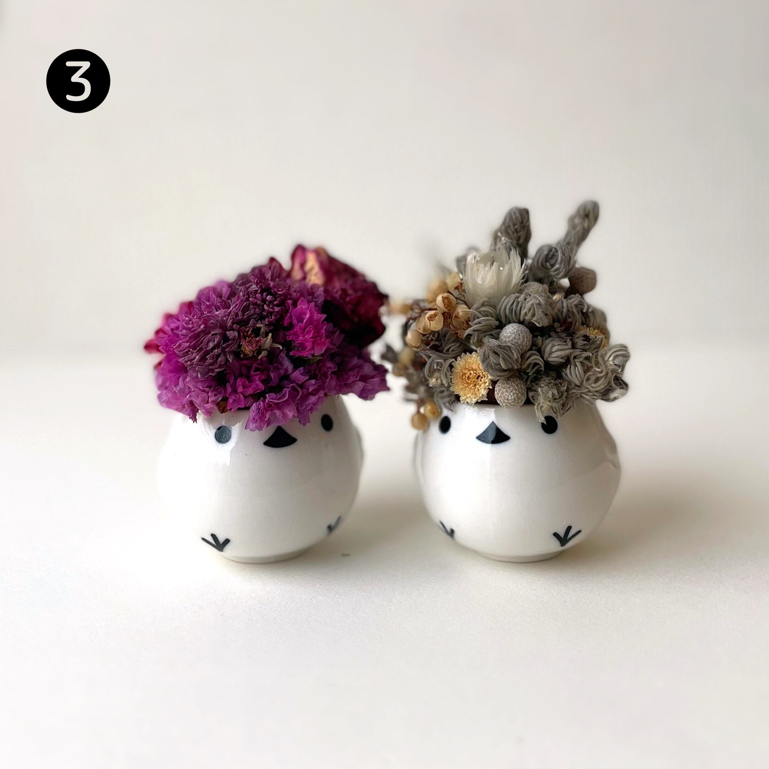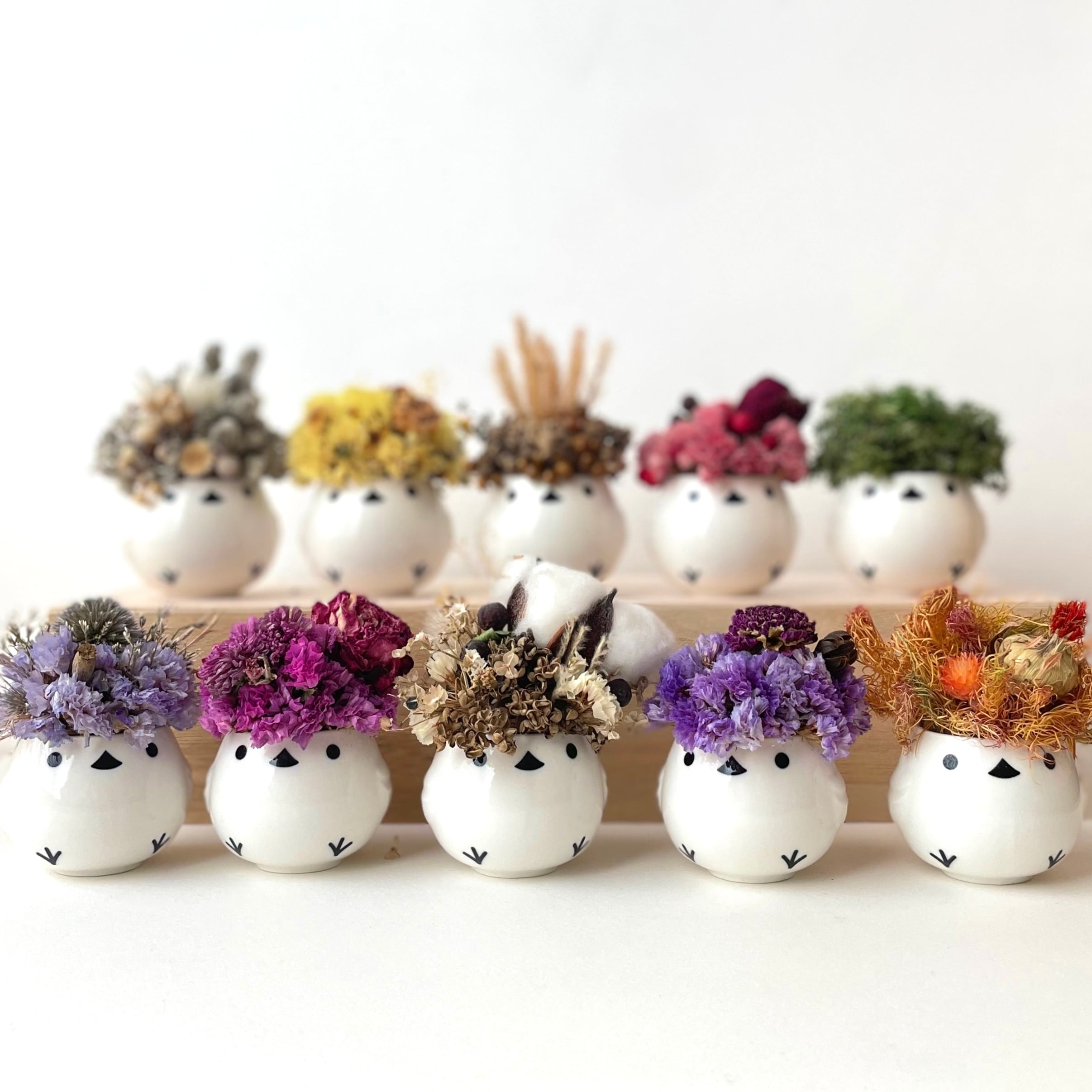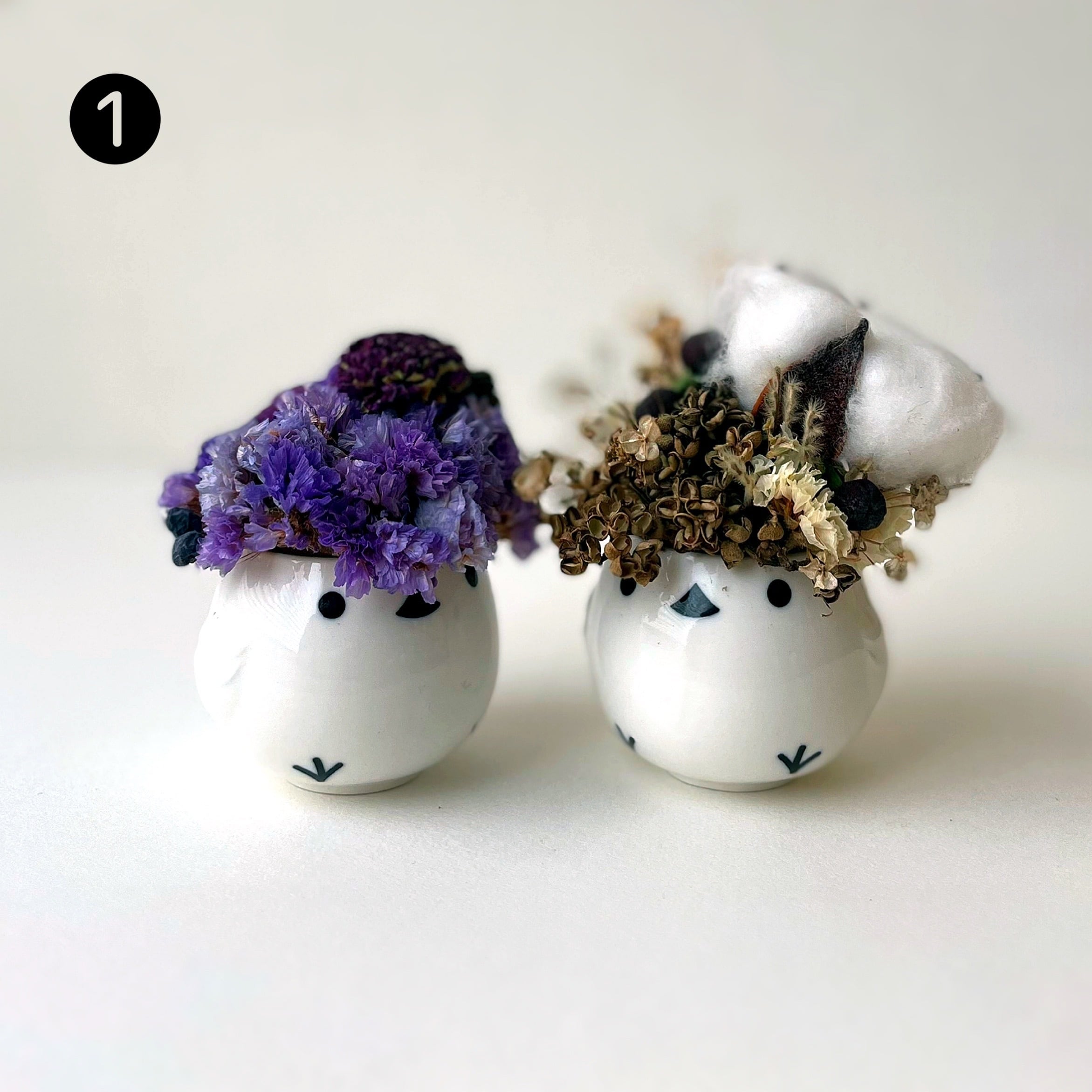 スターチスを中心に作った、シマエナガポット入りのドライフラワーのミニアレンジメント、高さ8〜10cm程度です。