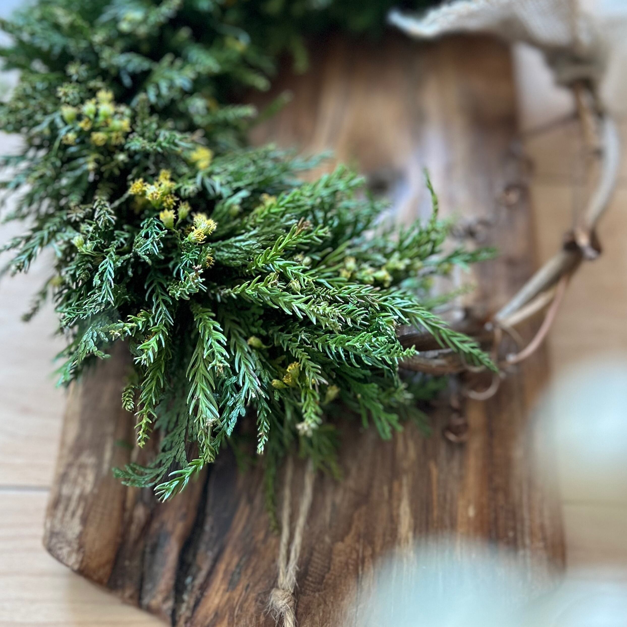 スギの葉を中心に、ヒノキ、アスナロ、野の花を束ねたフレッシュグリーンリース、直径30cm程度です。