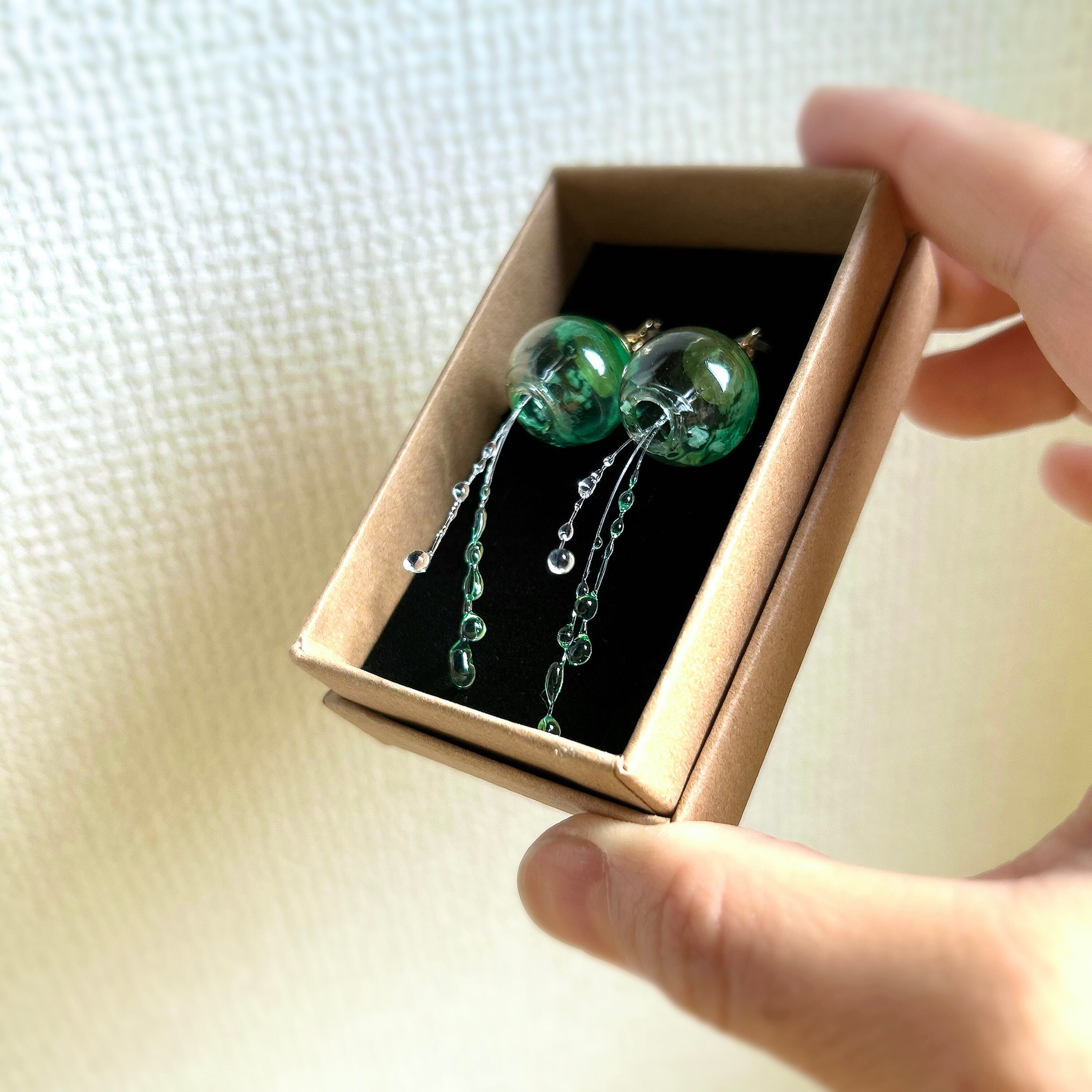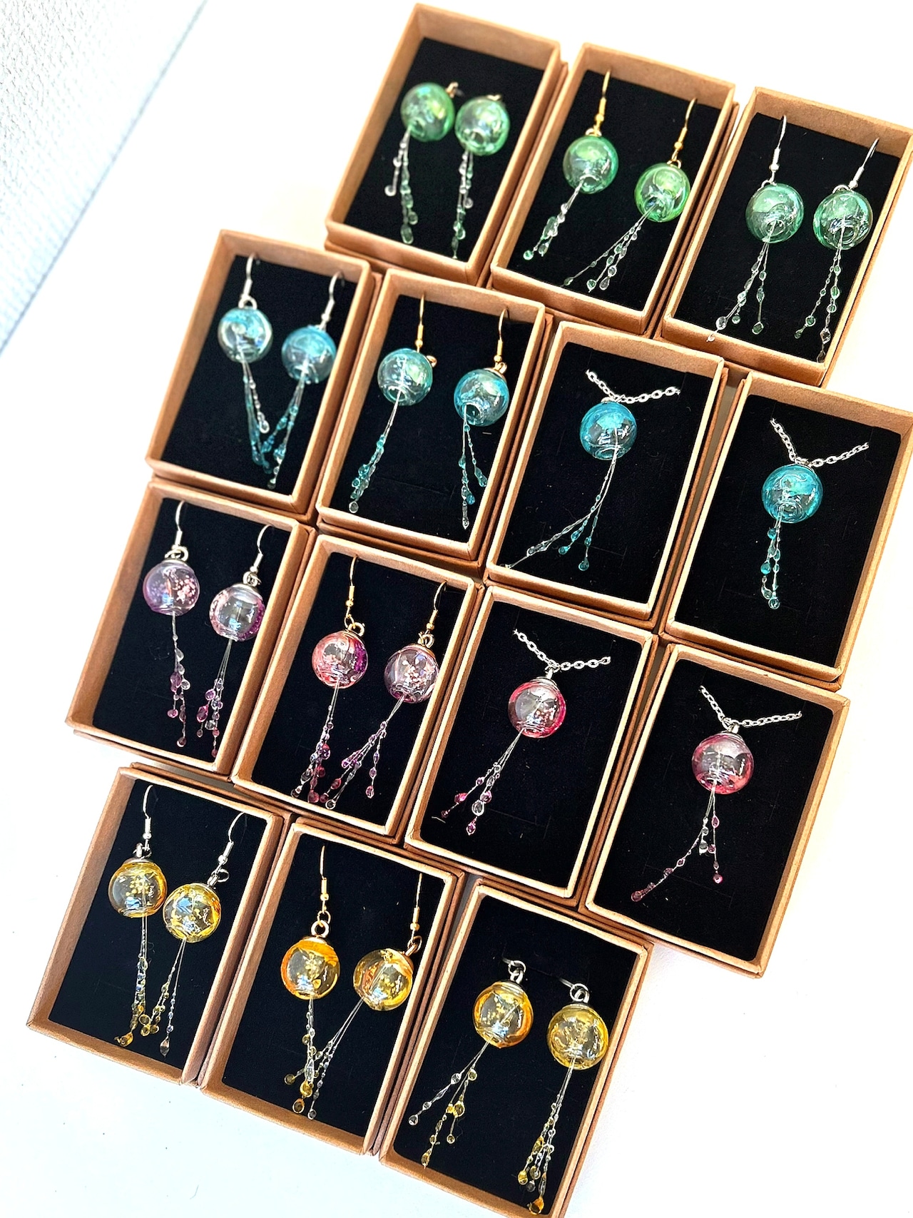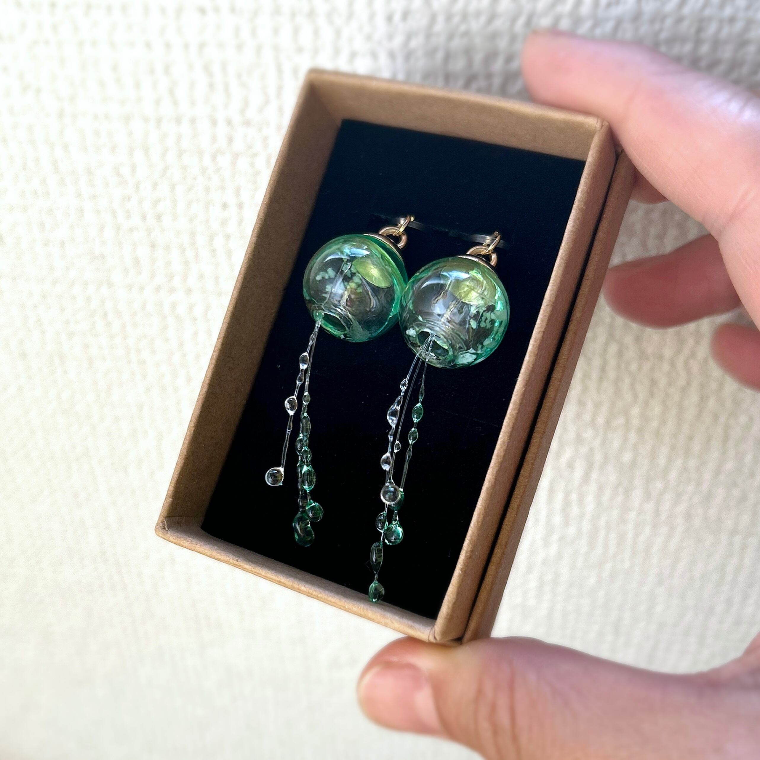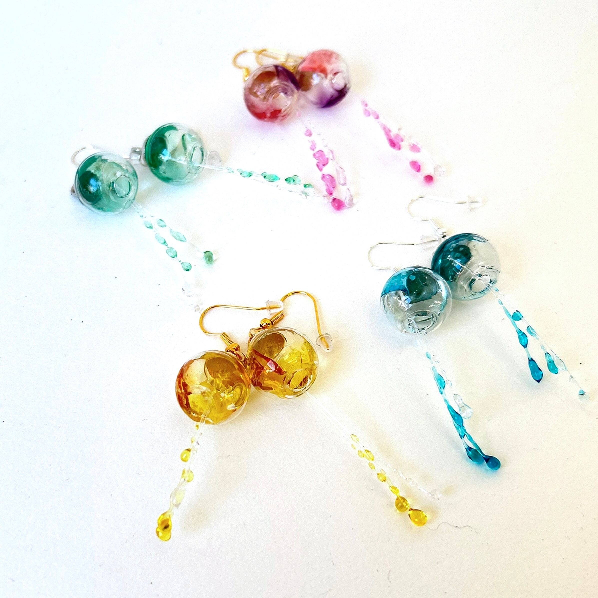 ガラスドームとレジンを使った、暗闇で光るクラゲのピアスです。