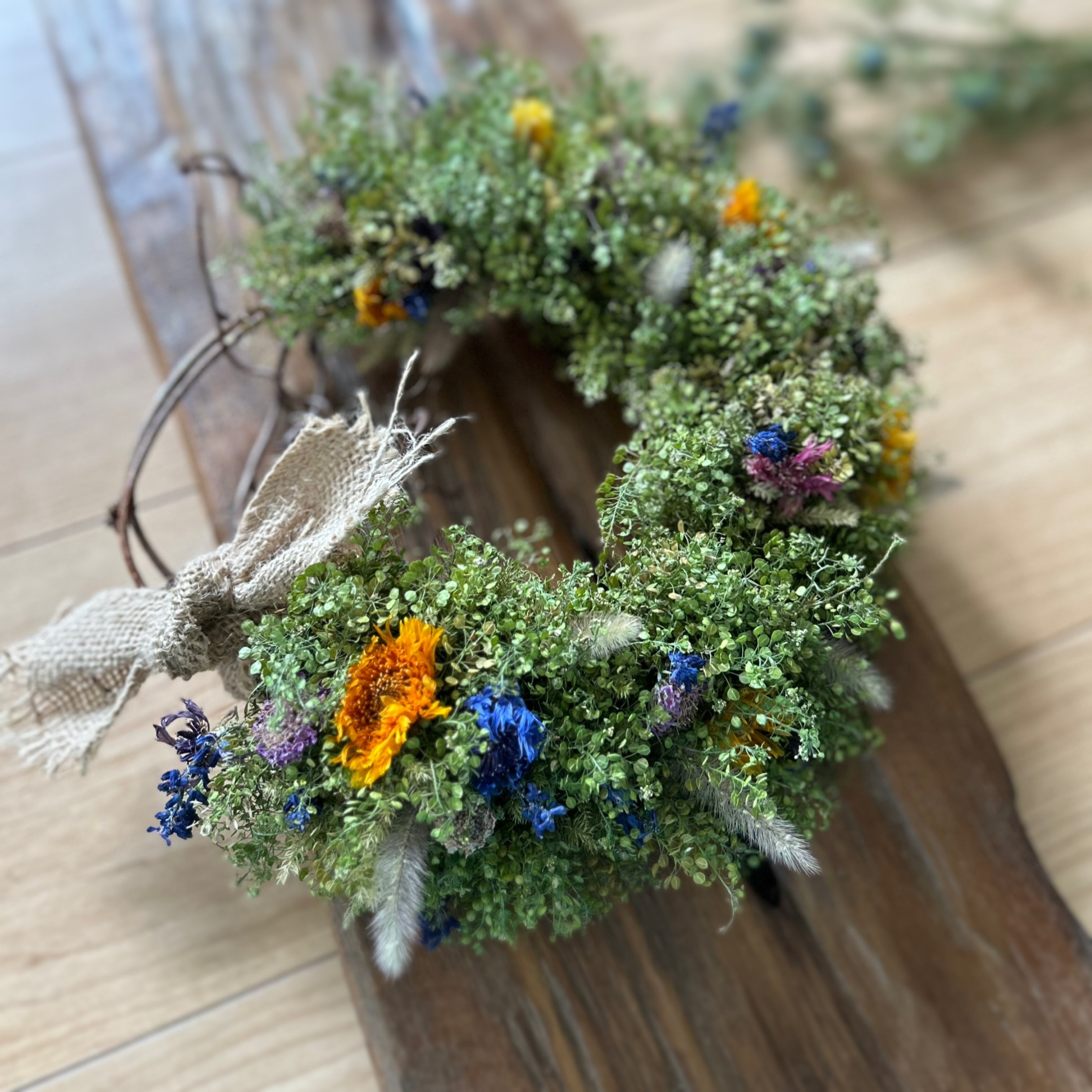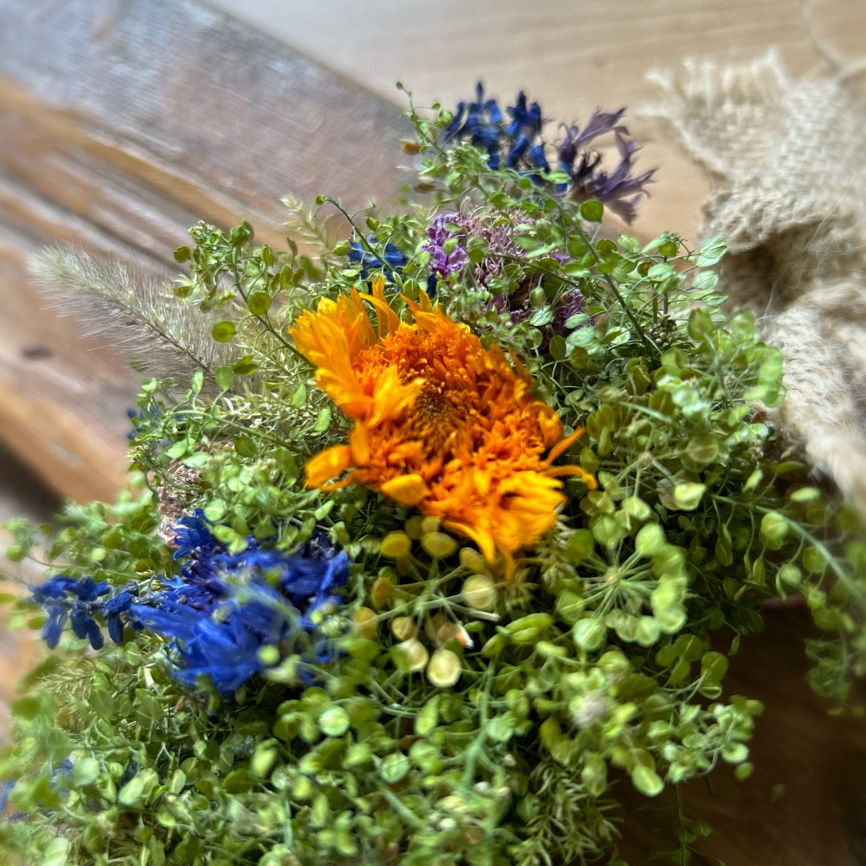 ドライが進むと、豆軍配ナズナのグリーンは徐々にくすんで黄色っぽくなっていきますが、それはそれでお楽しみいただけると思います。自然の素材ですので、その変化も含め、お楽しみください。直射日光の当たらない場所に飾っていただいた方が長持ちいたします。