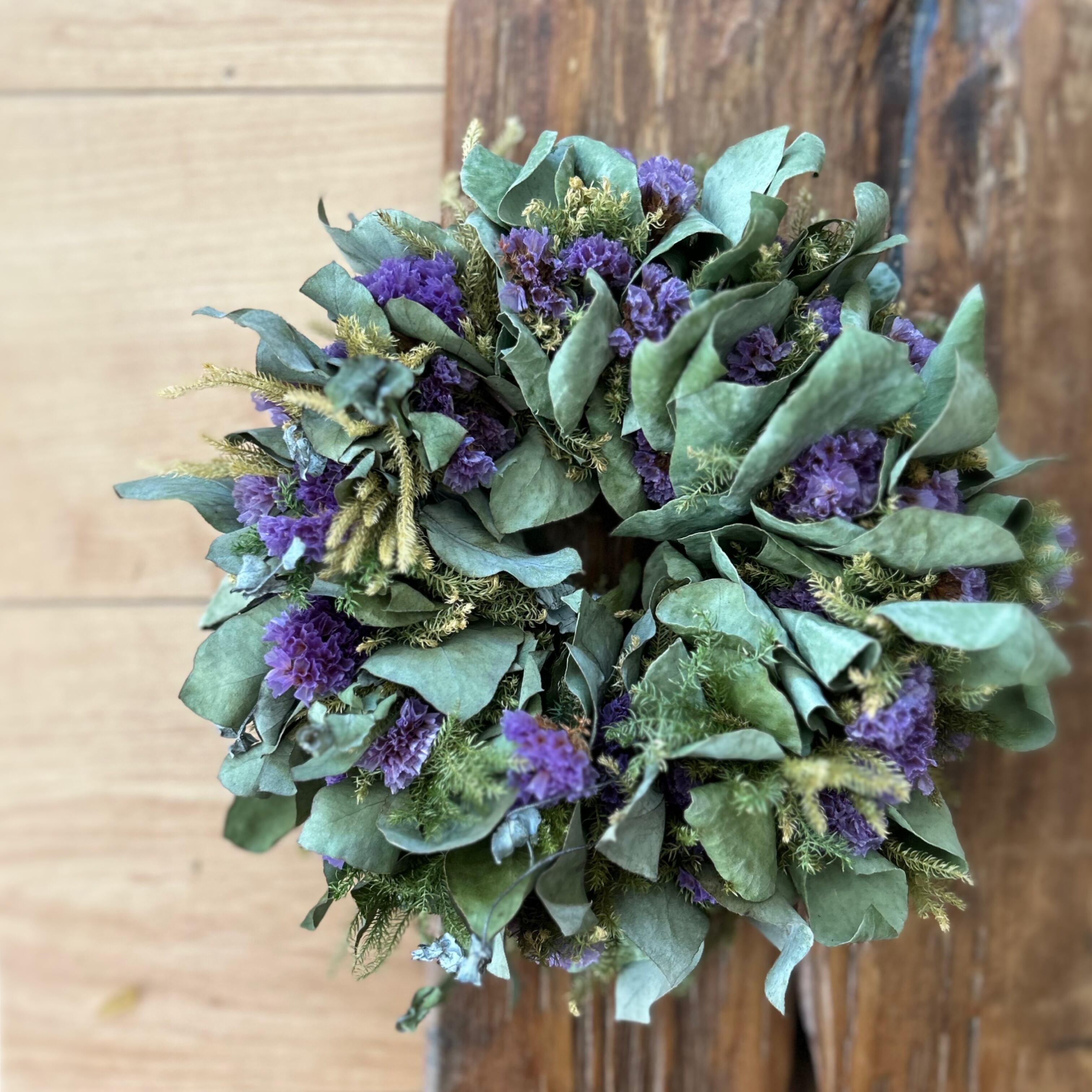 さらにドライが進むと、グリーンは徐々にくすんでいきますが、それはそれでお楽しみいただけると思います。スターチスの紫色は数年と長持ちします。自然の素材ですので、その変化も含め、お楽しみください。