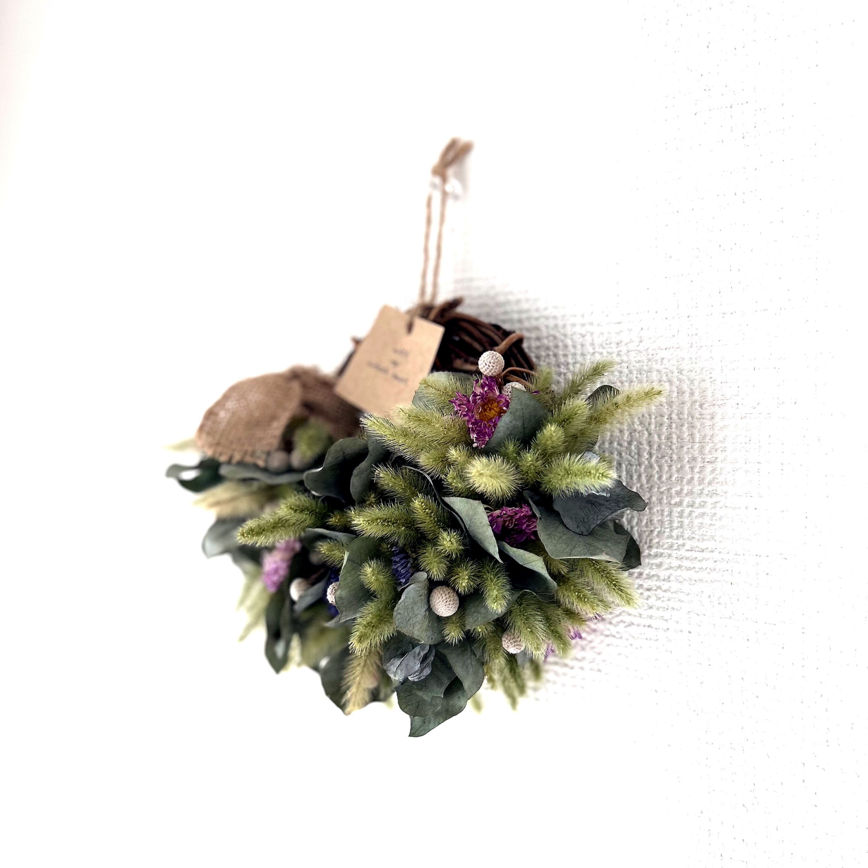 さらにドライが進むと、グリーンは徐々にくすんでいきますが、それはそれでお楽しみいただけると思います。自然の素材ですので、その変化も含め、お楽しみください。直射日光の当たらない場所に飾っていただいた方が長持ちいたします。