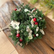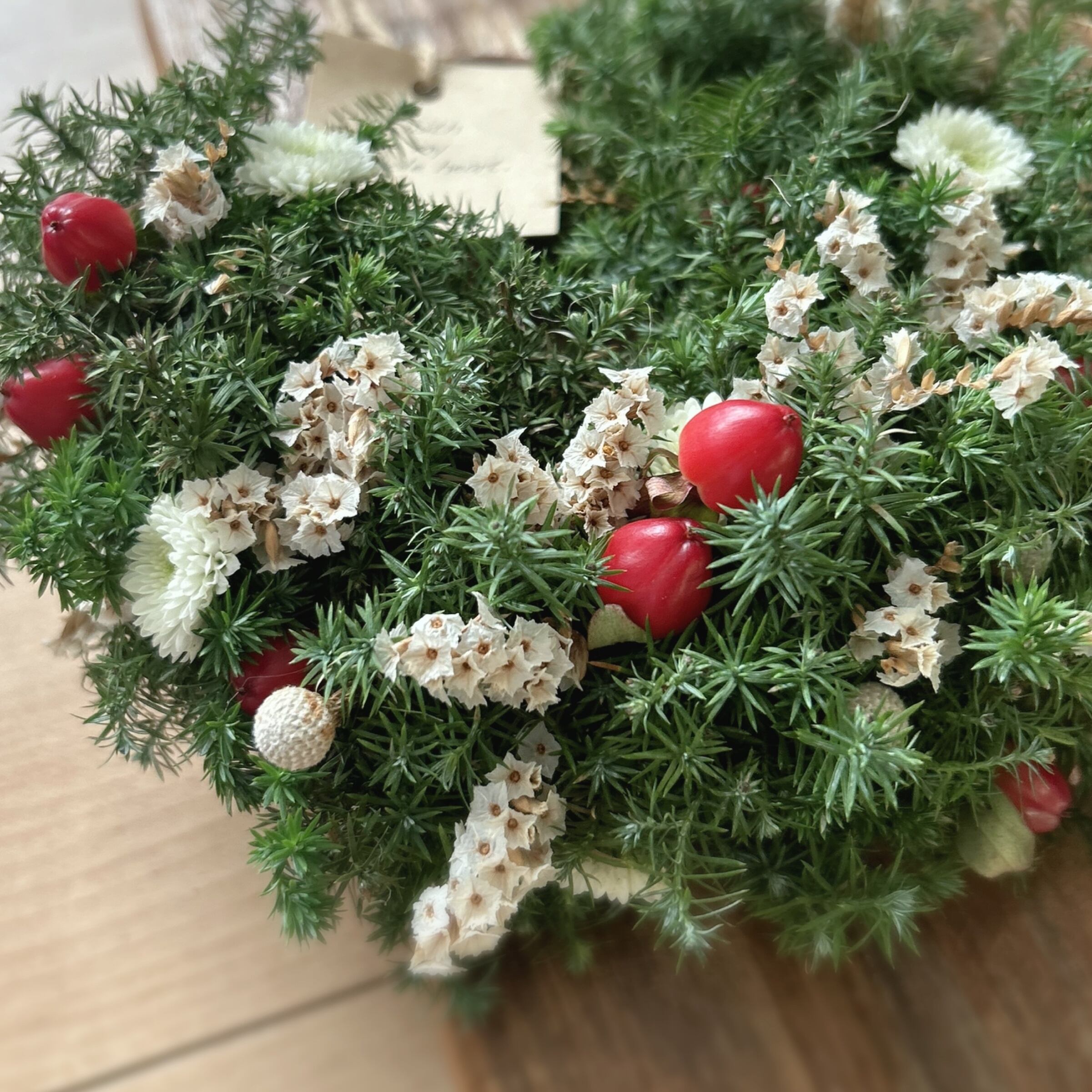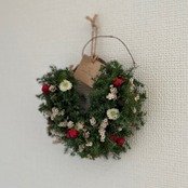 ヒムロスギとドライフラワーを中心に作ったグリーンリース、幅15cm程度です。